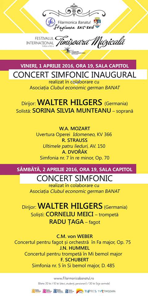 Orchestra Filarmonicii va fi dirijată de Walter Hilgers (Germania), solistă, soprana Sorina Silvia Munteanu.
