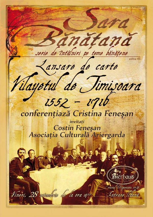 28 noiembrie 2014 @ ore diverse – Liga Bănăţeană organizează vineri, 28 noiembrie, de la ora 18:00, o ediție specială a “Serii Bănăţene” prilejuită de lansarea unei cărți importante pentru istoria regiunii. “Vilayetul de Timişoara 1552 – 1716″ este cel mai recent studiu al cercetătoarei Cristina Feneşan şi aduce noutăți esențiale despre evoluţia Banatului în perioada dominației otomane, clarificând astfel multe aspecte […]