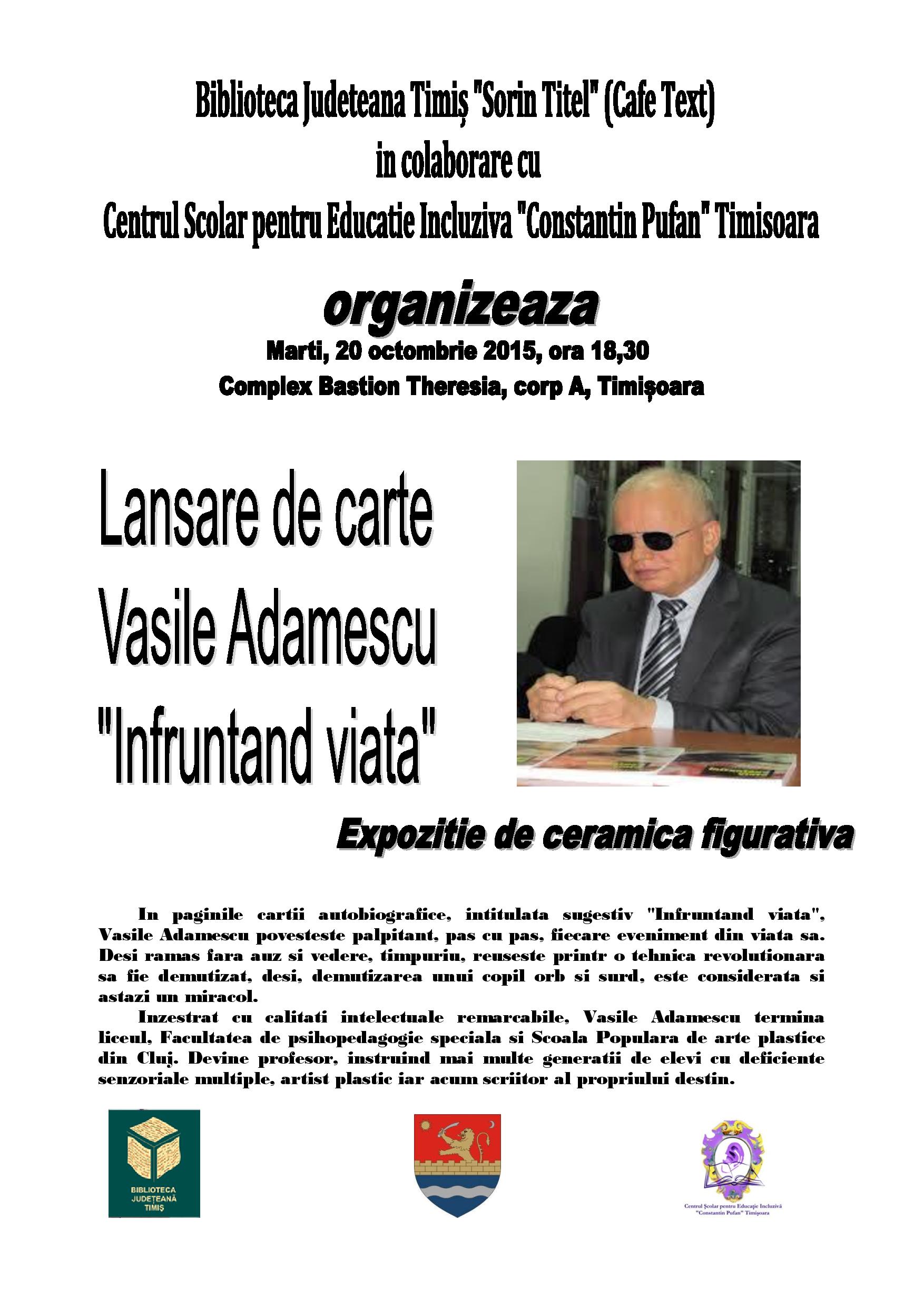 Lansare de carte la Timişoara: „Înfruntând viaţa” de Vasile Adamescu, o carte unicat în România