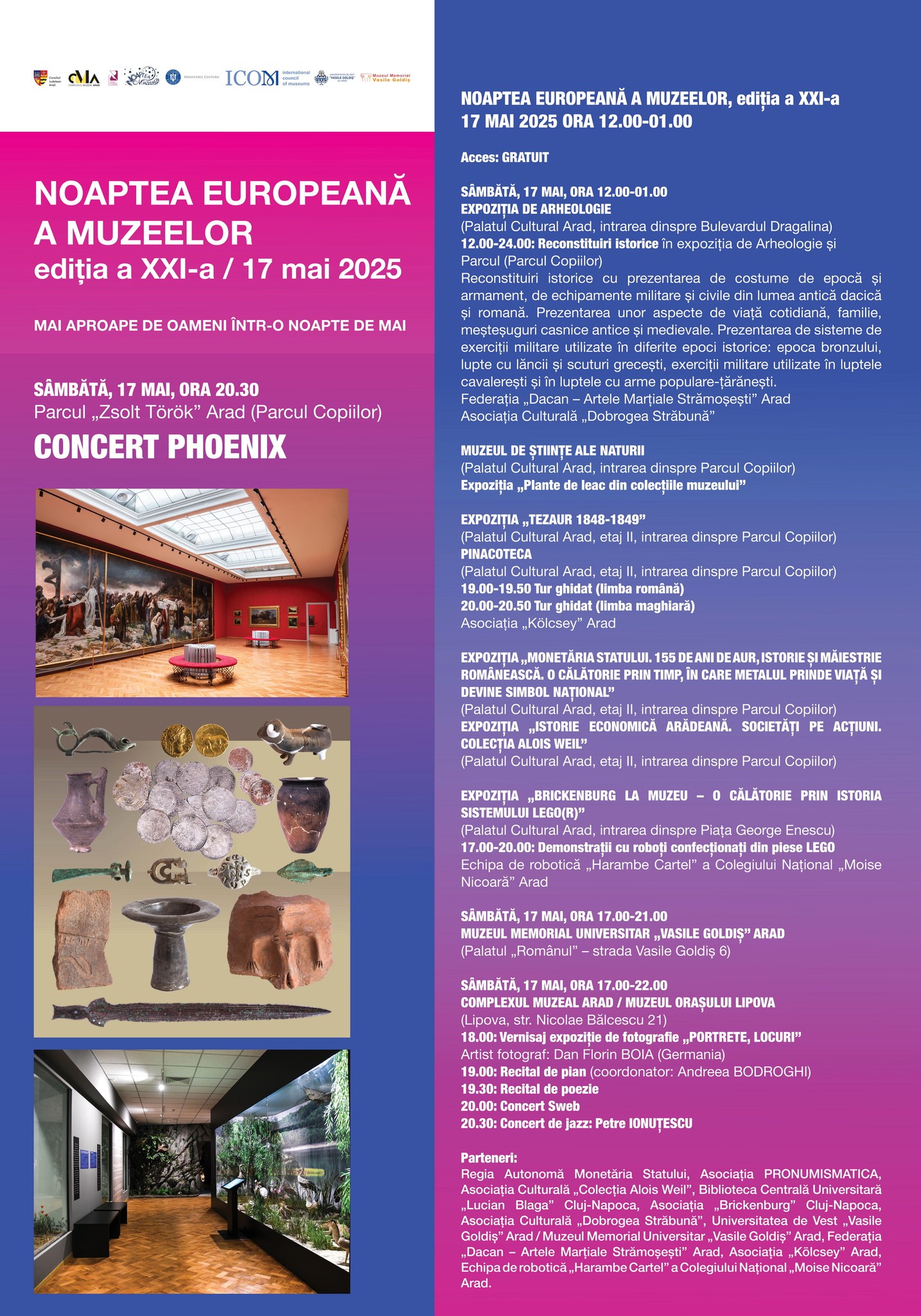 Vor fi deschise spațiile expoziționale ale Complexului Muzeal Arad și, în premieră, Muzeul Memorial Universitar ”Vasile Goldiș”. În Parcul Copiilor va avea loc un concert Phoenix.