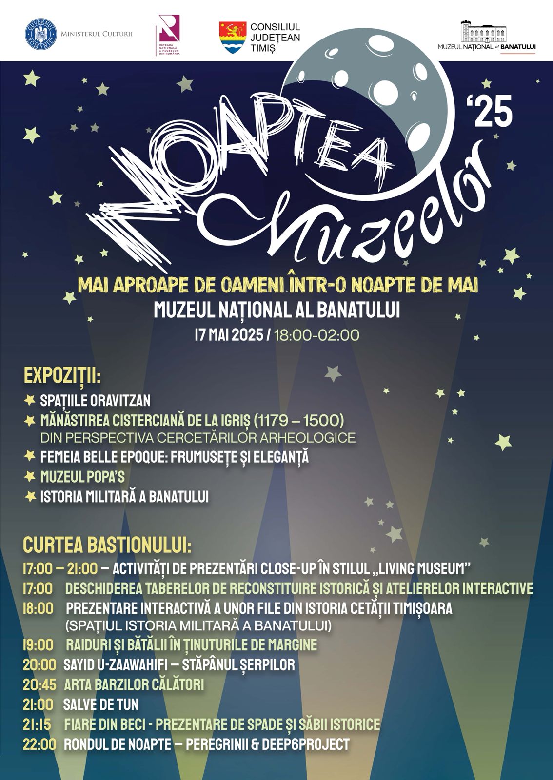 Sub genericul „Mai aproape de oameni într-o noapte de mai” publicul este invitat sâmbătă, 17 mai 2025, între orele 18:00 și 02:00, să participe la un maraton cultural care aduce împreună patrimoniul, istoria vie, artele vizuale, performance-ul istoric și muzica.