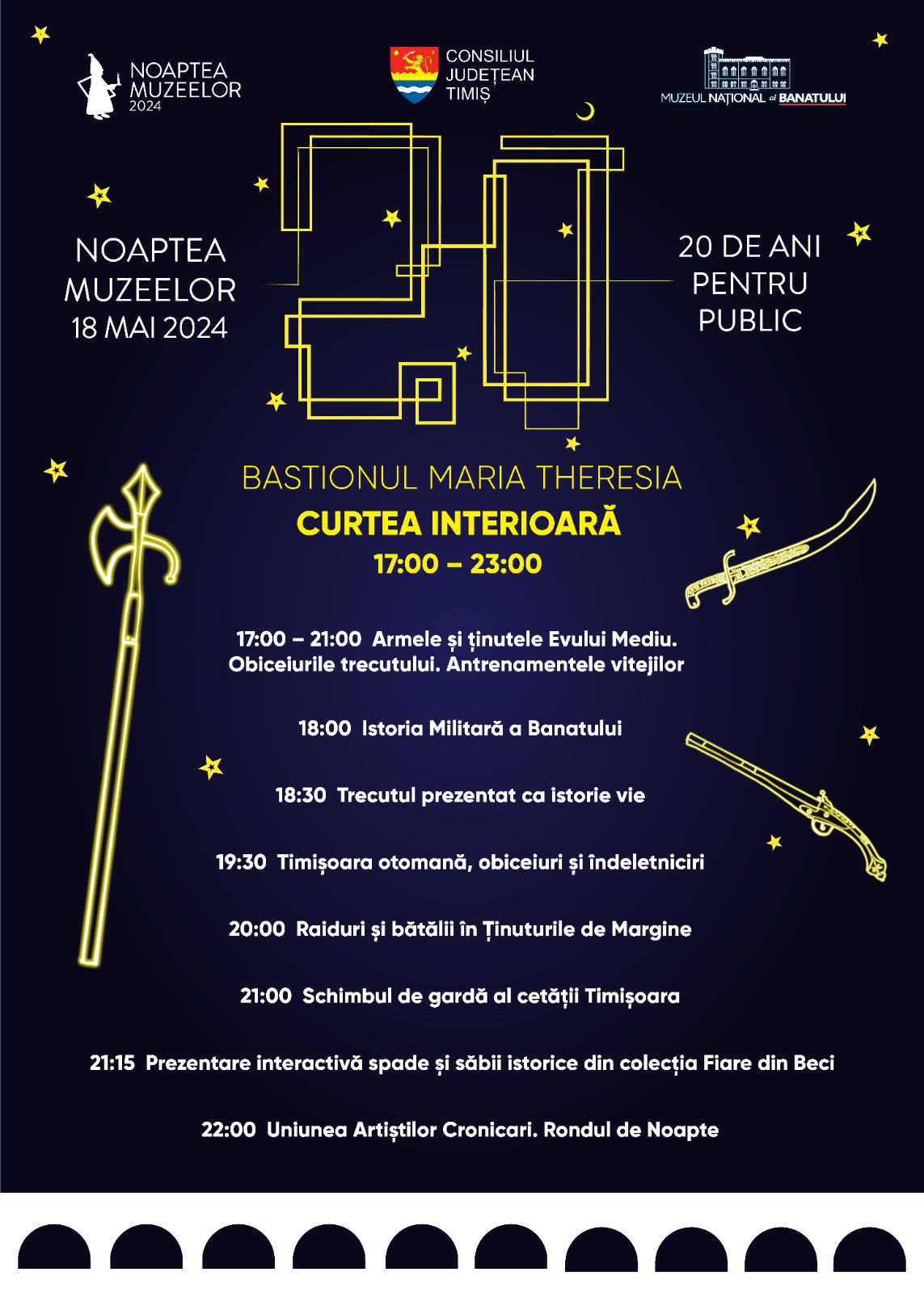 - 18:00 – Spațiul „Istoria Militară a Banatului”, intrare din curtea Bastionului – Asociația de Reconstituiri Istorice Timișoara – Prezentare interactivă a unor file din istoria Cetății Timișoara.