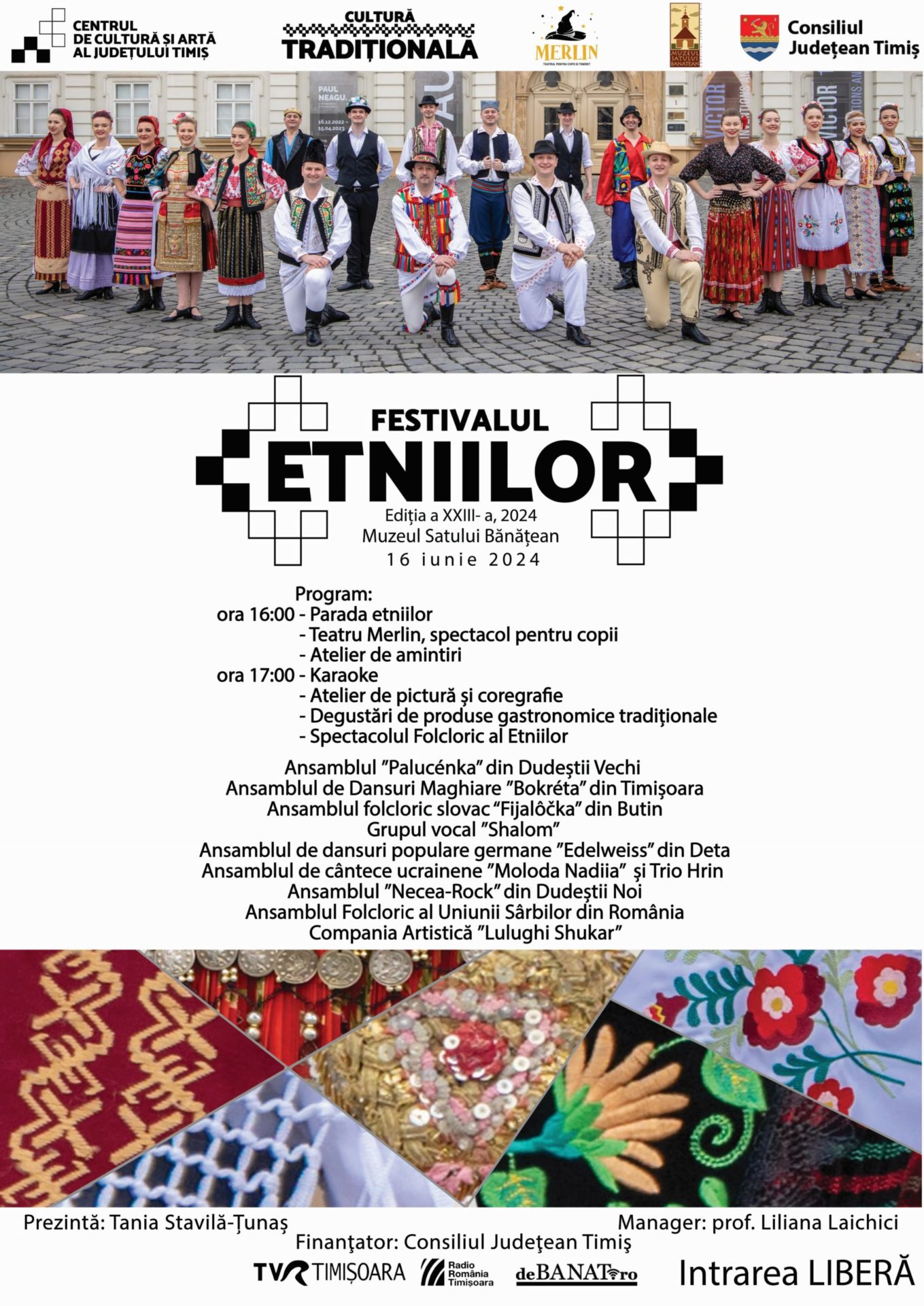 Sârbi, bulgari, evrei, maghiari, rromi, ucraineni, slovaci, germani și machedoni vor recrea atmosfera Banatului de altădată la Muzeul Satului Bănățean din Timișoara. Într-un format nou, Festivalul Etniilor vă propune un eveniment divers cu ateliere de dansuri, karaoke, teatru pentru copii, atelier de amintiri, atelier de pictură, degustări de produse tradiționale, spectacol folcloric și multe surprize. Nouă etnii vor aduce pe scena de la Muzeul Satului Bănățean frumusețea costumelor tradiționale, a dansurilor și a cântecelor tradiționale.