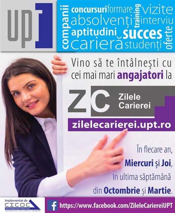 Universitatea politehnica Timişoara organizează în perioada 30 – 31 martie 2016 a opta ediţie a evenimentului ,,Zilele Carierei în UPT”, manifestare destinată studenţilor, masteranzilor şi absolvenţilor, dar şi companiilor şi instituţiilor de profil interesate să ofere oportunităţi de carieră pentru tineri.