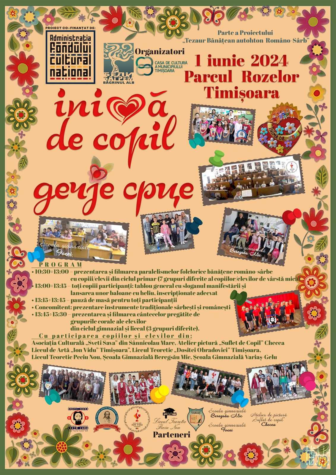 Sâmbătă, 1 iunie 2024, în Parcul Rozelor din Timișoara va avea loc sub sloganul „Inimă de copil/Dečije srce” prezentarea și filmarea setului de „paralelisme” foclorice dedicate copiilor, eveniment organizat de Asociația culturală „Beli Bagrem/Băgrinul Alb” în cadrul proiectului ”Tezaur bănățean autohton, româno-sârb”.