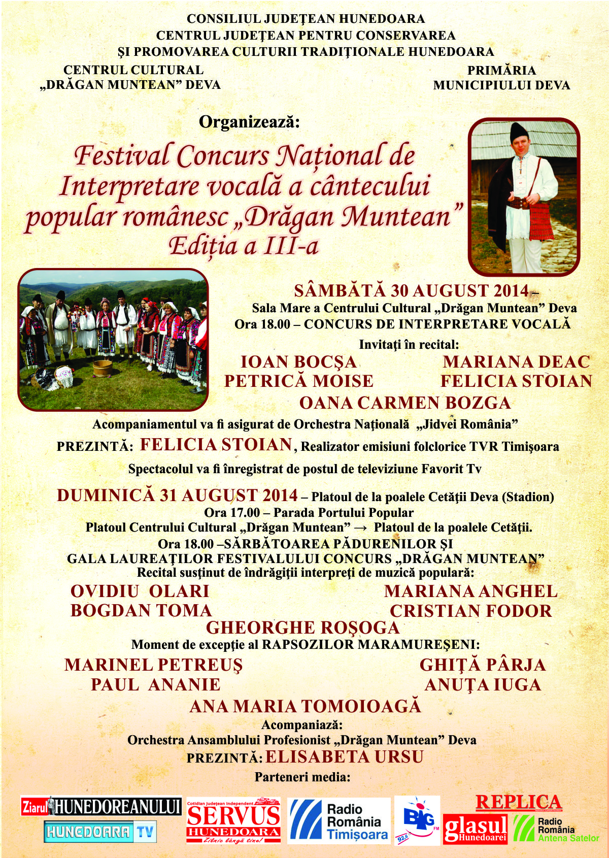 30 august 2014 – 31 august 2014 @ ore diverse – Vineri, 29 aug, ora 12.00, la Centrul Cultural “Drăgan Muntean” din Deva vor fi selectaţi cei mai buni interpreţi pentru a participa sâmbătă la concursul de interpretare vocală. Sărbătoarea Pădurenilor, iniţiată de regretatul interpret, este inclusă în festivalul ce-i poartă numele. În cele două zile, sâmbătă şi duminică, vor susţine recitaluri interpreţi de referinţă ai […]