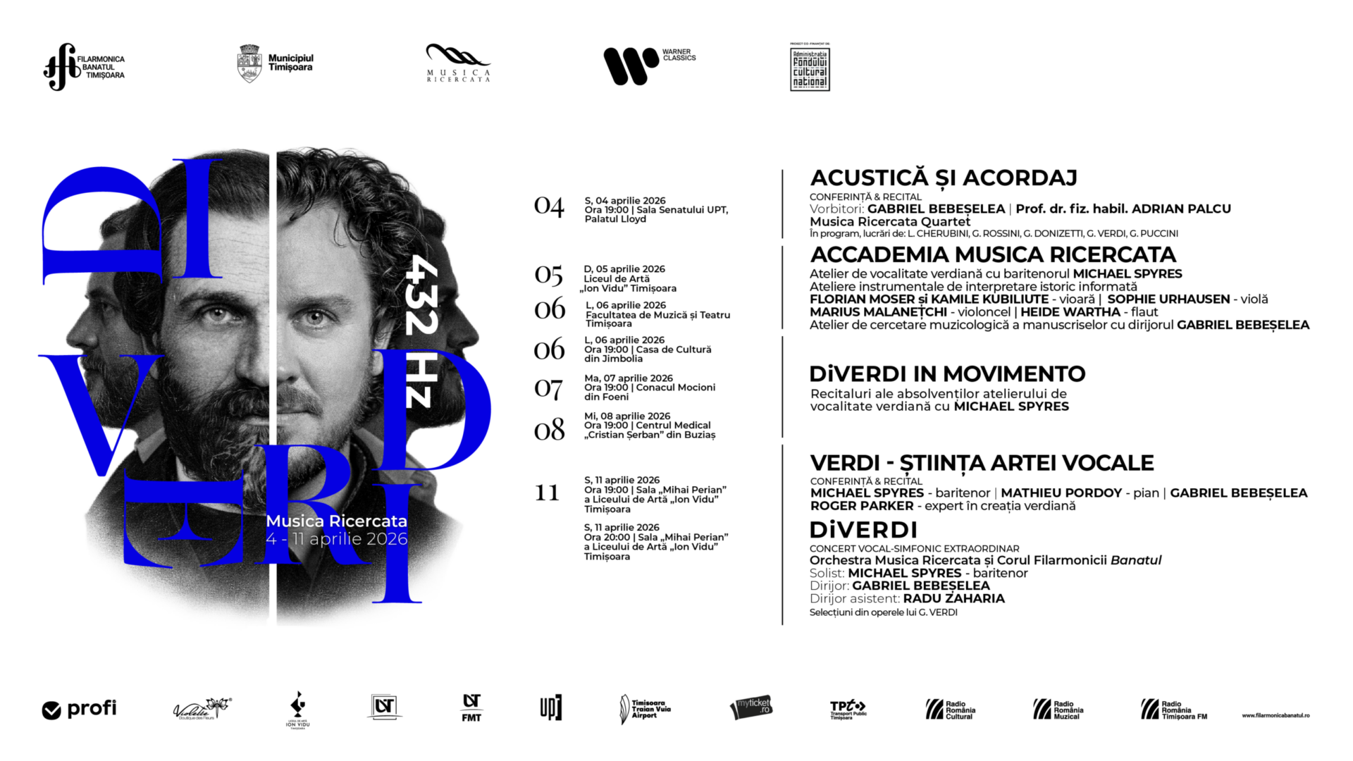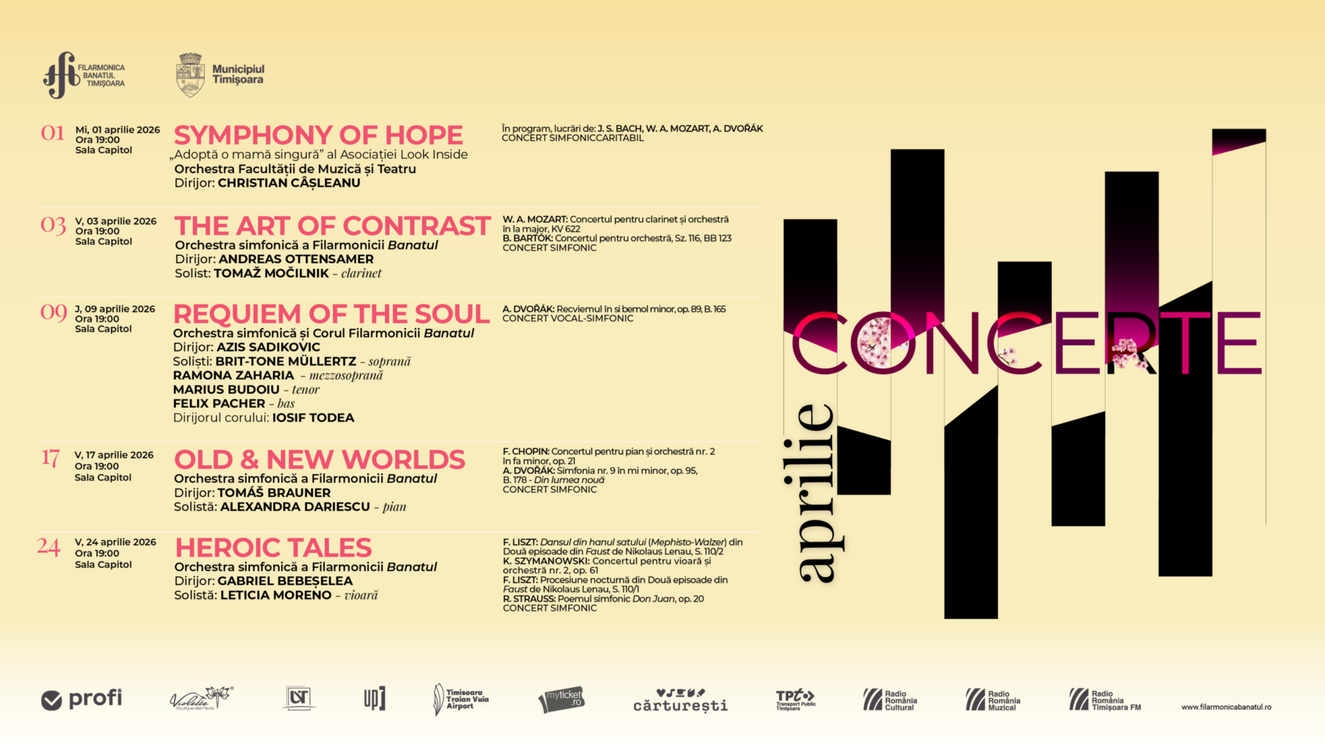 Filarmonica Banatul Timișoara propune în luna aprilie un program amplu, ce reunește concerte simfonice, recitaluri și proiecte dedicate publicului de toate vârstele. Un moment de referință îl reprezintă participarea baritenorului american Michael Spyres, prezent pentru prima dată în România, într-un proiect dedicat creației verdiene. În jurul acestui eveniment gravitează o serie de concerte și recitaluri ce explorează diversitatea expresivă a muzicii clasice, de la lucrări canonice la formule artistice inovatoare.