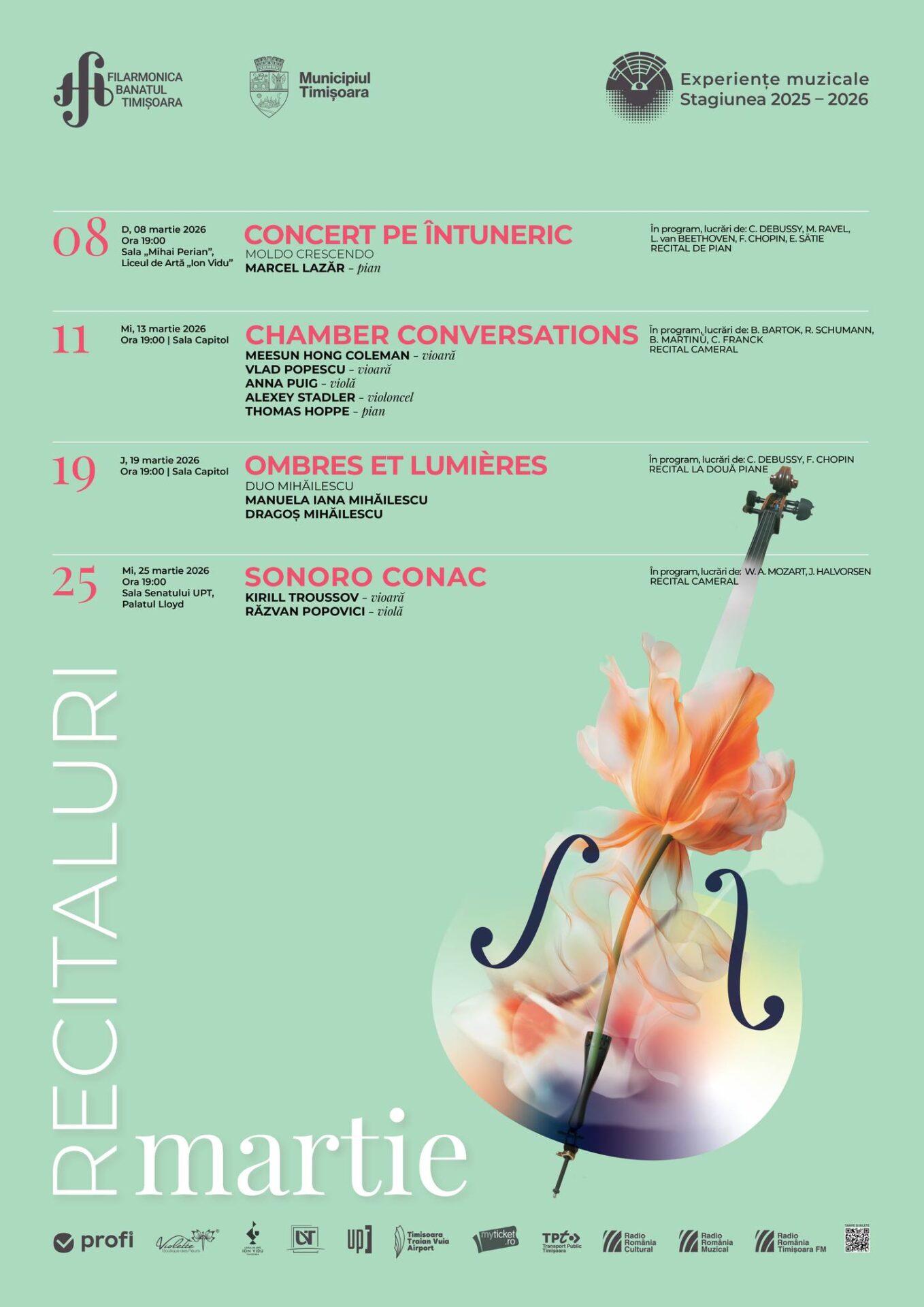 Unul dintre cele mai frumoase proiecte dedicate muzicii de cameră din România, inițiat de violistul Răzvan Popovici. Sonoro Conac aduce muzica în spații de patrimoniu și clădiri cu istorie, creând o experiență intimă și elegantă. La Timișoara, Kirill Troussov și Răzvan Popovici propun un program Mozart & Halvorsen — virtuozitate și rafinament într-un cadru aparte.