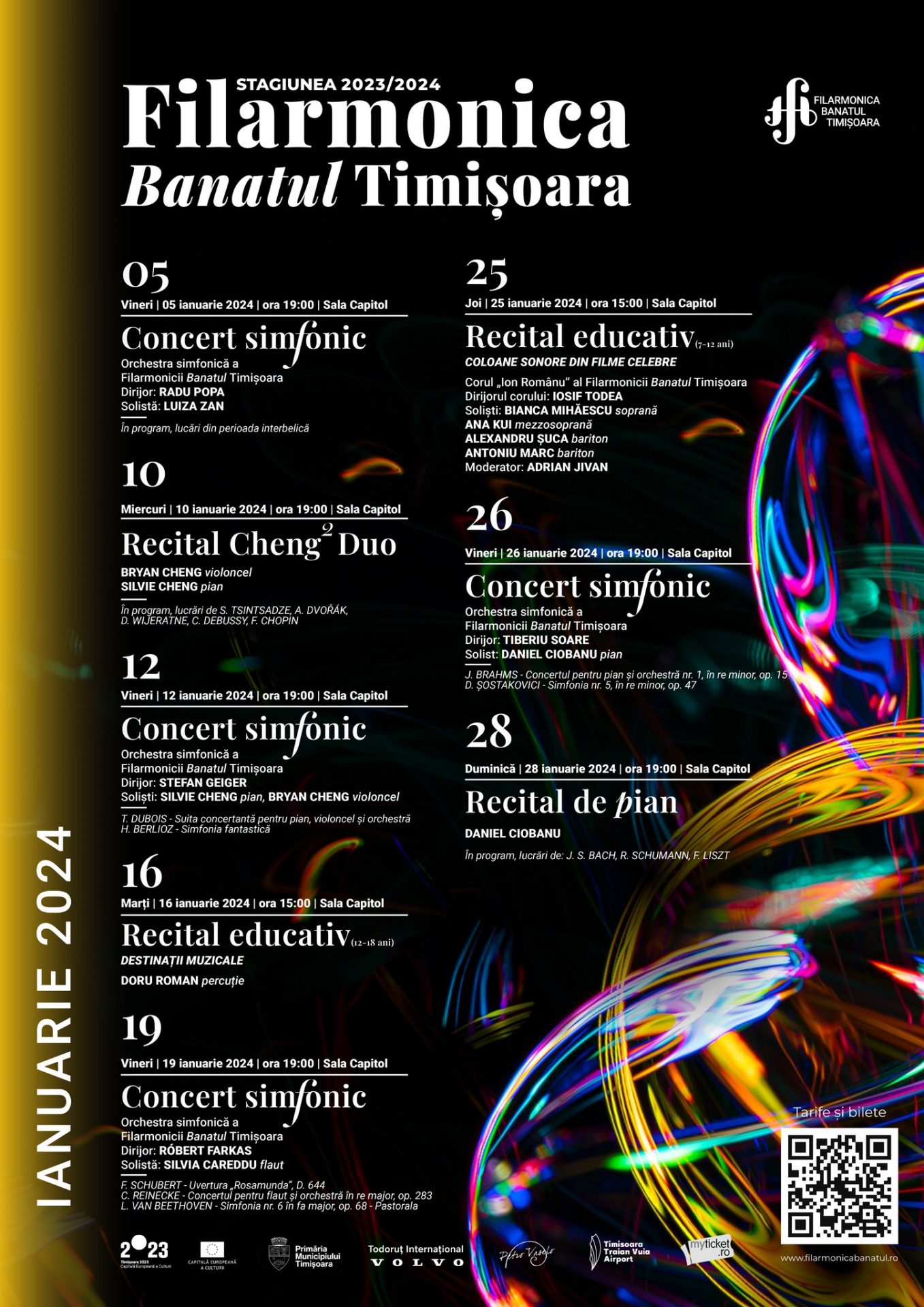 5 ianuarie 2024 – 28 ianuarie 2024 @ 19:00 – Vineri, 5 ianuarie, de la ora 19:00, la Sala Capitol LUIZA ZAN va interpreta o serie de lucrări românești și internaționale specifice perioadei interbelice, alături de Orchestra simfonică a Filarmonicii Banatul Timișoara, sub conducerea maestrului RADU POPA. Miercuri, 10 ianuarie 2024, ora 19:00 – Sala Capitol RECITAL Cheng² Duo | BRYAN CHENG – violoncel, SILVIE […]