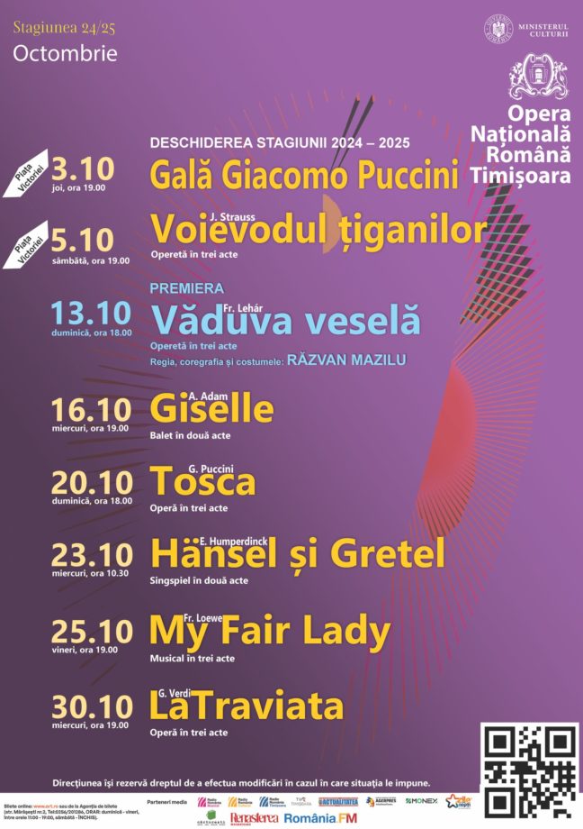 Opera Națională Română din Timișoara deschide stagiunea 2024-2025, în aer liber (în Piața Victoriei) cu Gala Giacomo Puccini, la data de 3 octombrie 2024, ora: 19.00  – un omagiu adus marelui compozitor italian și la data de 5 octombrie 2024, ora: 19.00 tot în Piața Victoriei continuăm cu opereta „Voievodul țiganilor” de Johann Strauss.