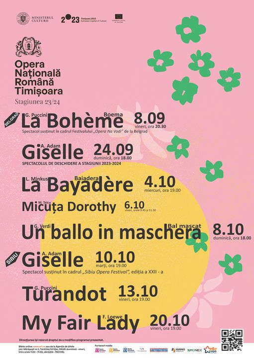 24 septembrie 2023 – 20 octombrie 2023 @ 19:00 – Opera Națională Română din Timișoara vă invită duminică, 24 septembrie 2023, ora: 18.00 la deschiderea stagiunii 2023-2024 la spectacolul de balet „Giselle” de Adolphe Charles Adam. Detalii: https://www.ort.ro/eveniment/610/ro/Giselle.html https://www.facebook.com/events/646736437568924 Următoarele spectacole sunt: Miercuri, 4 octombrie 2023, ora: 19.00 La Bayadère de Ludwig Minkus Spectacol de balet. Detalii: https://www.ort.ro/eveniment/613/ro/La-Bayadère–Baiadera-.html https://www.facebook.com/events/1731155207332866 Vineri, 6 octombrie 2023, orele: 09.45 și 11.30 Micuța Dorothy de […]