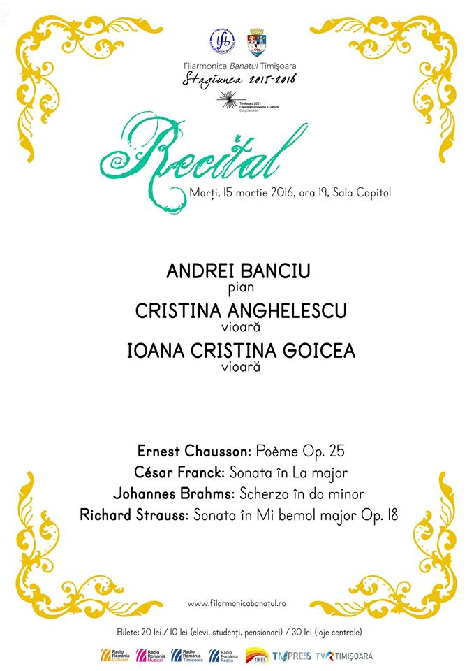 Recital cameral marţi, 15 martie 2016, de la ora 19.00, la Filarmonica Banatul, susţinut de Andrei Banciu – pian, Cristina Anghelescu – vioară şi Ioana Cristina Goicea – vioară.