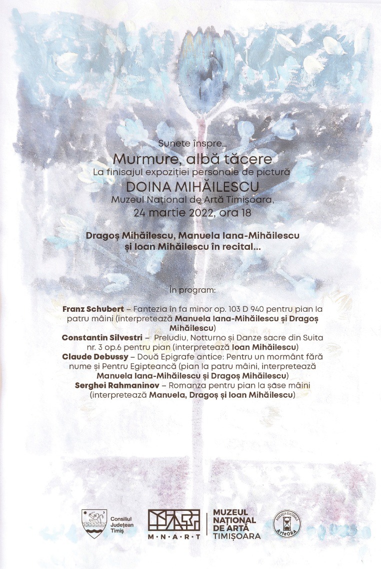 Recitalul este susținut de soliști ai Filarmonicii Banatul cu ocazia finisajului expoziției „Murmure, albă tăcere” a artistei Doina Mihăilescu.