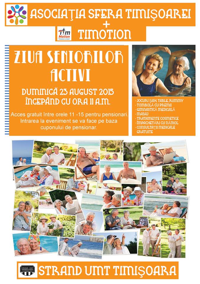 Seniorii activi, cu chef de viaţă, sunt invitaţi să ia parte la „Ziua Seniorilor Activi”, eveniment organizat de Sfera Timişoarei duminică, 23 august 2015, la Ştrandul UMT din Timişoara, începând cu ora 11.00.