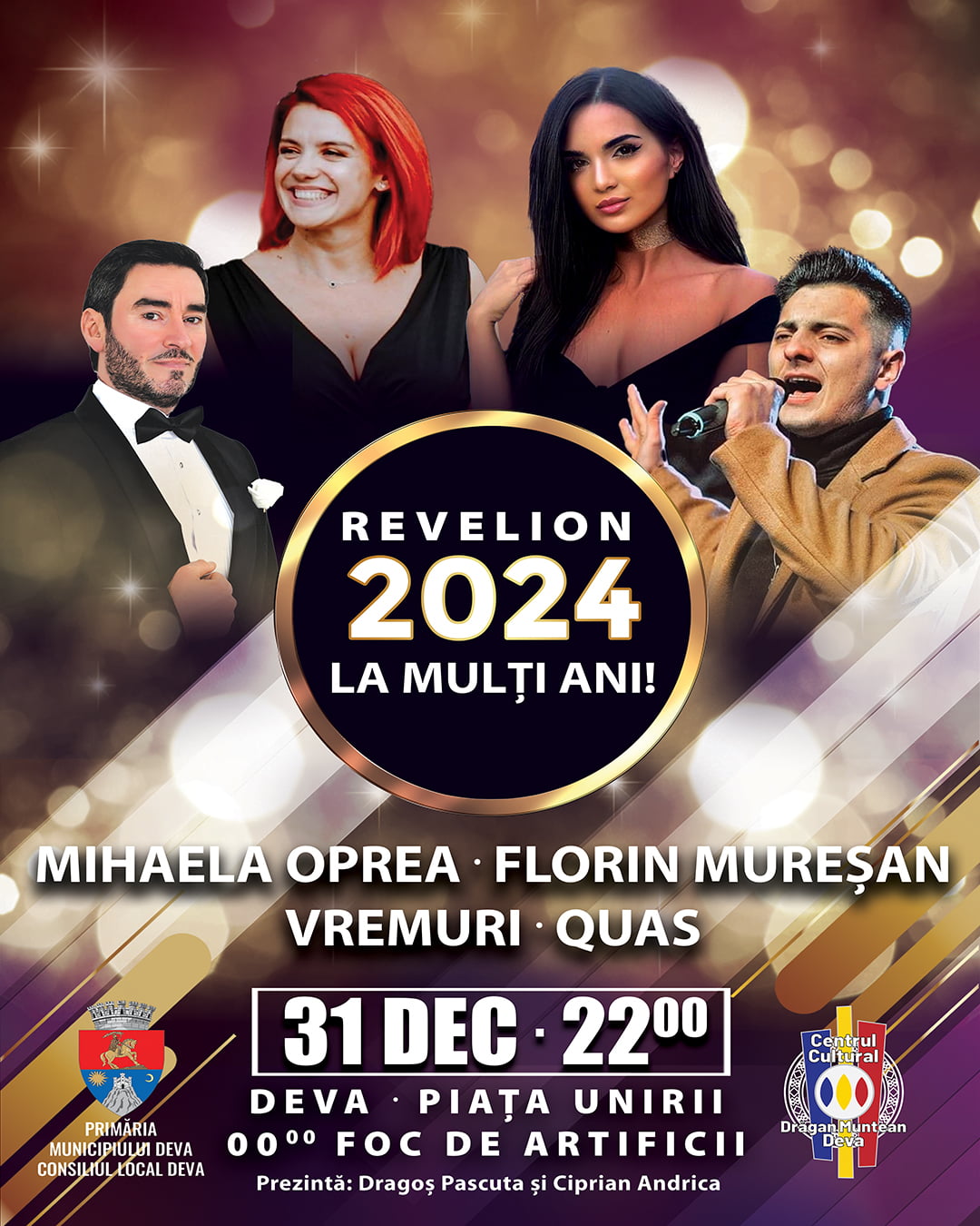 La Deva, publicul este invitat să întâmpine Noul An 2024 în Piața Unirii, unde vor avea loc concerte, dar și un impresionant foc de artificii.
