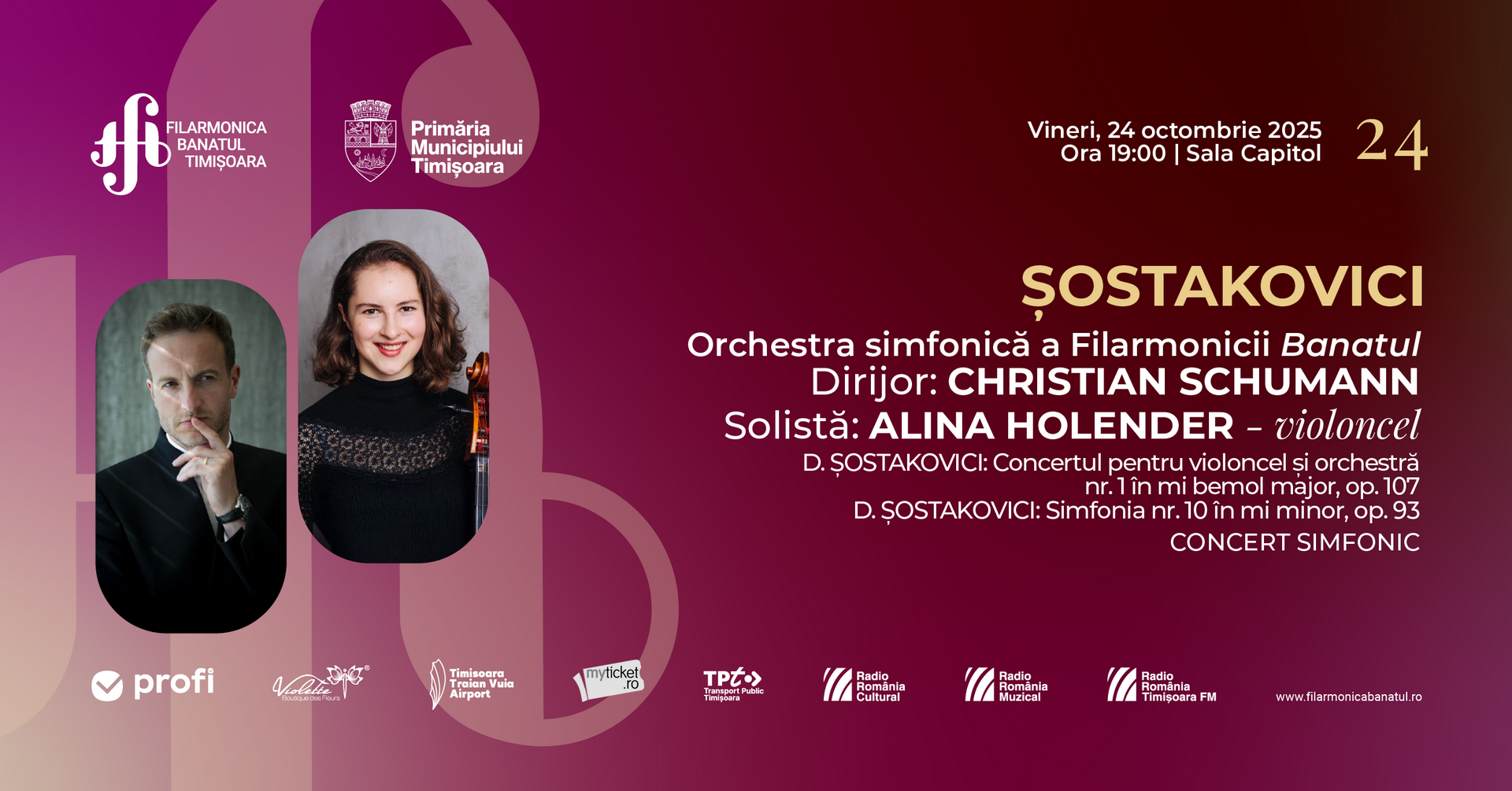 Sub bagheta dirijorului Christian Schumann, Orchestra simfonică a Filarmonicii Banatul Timișoara și violoncelista Alina Holender vor interpreta Concertul pentru violoncel și orchestră nr. 1 în mi bemol major, de D. Șostakovici. Apoi, spectatorii se vor bucura de celebra Simfonie nr. 10 a lui aceluiași compozitor, o lucrare profundă și plină de tensiune, care va completa această seară memorabilă.