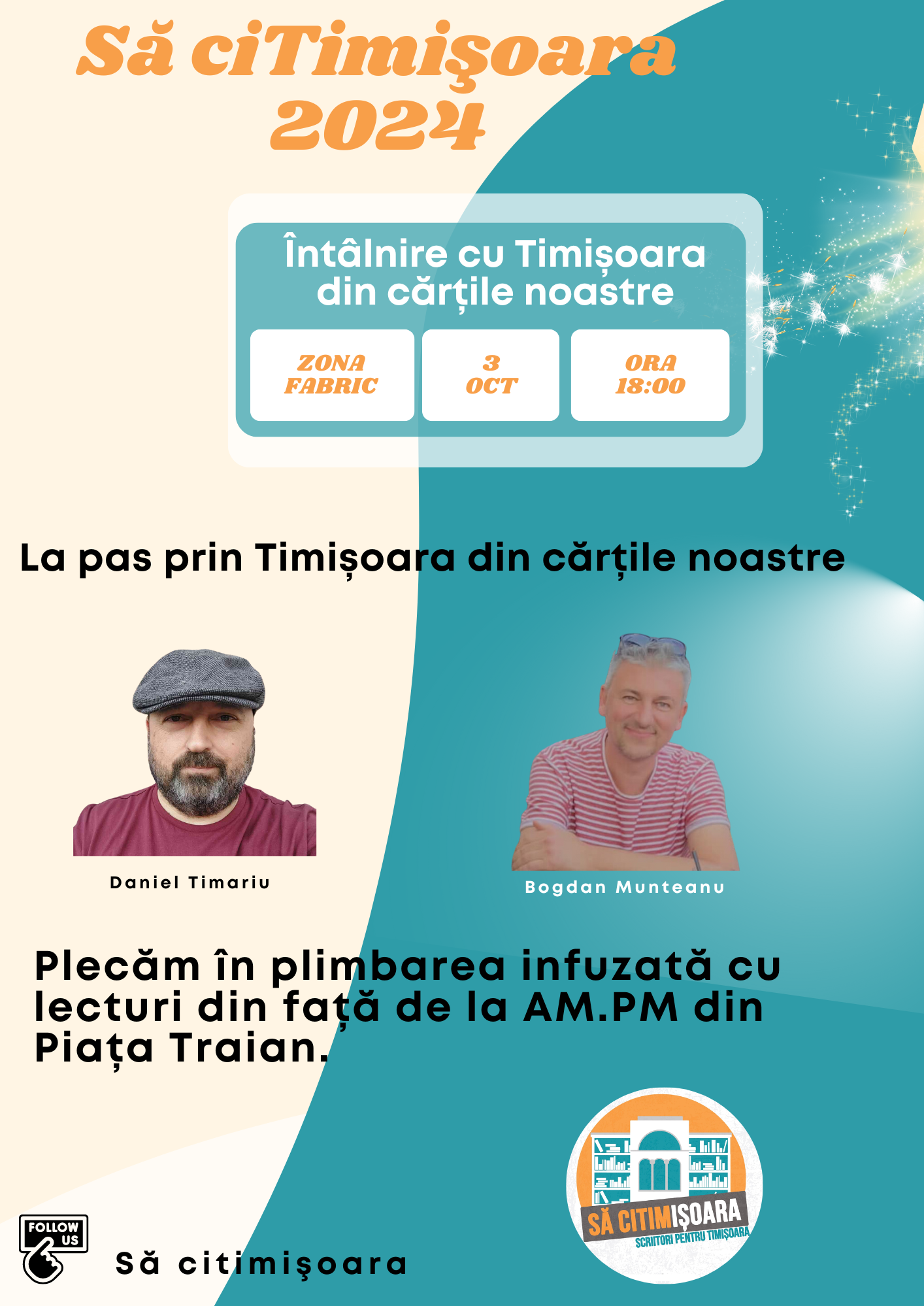 Joi, 3 octombrie, la ora 18.00, organizatorii Patricia Lidia Popescu Cevei şi Adrian Petru Stepan vă aşteaptă în faţa localului AM.PM din Piaţa Traian pentru a pleca într-o plimbare din al cărui traseu nu vor lipsi Biserica Millenium ori sinagoga. Ghizi literari vor fi scriitorii Bogdan Munteanu şi Daniel Timariu, care vor citi două povestiri inspirate de aceste locuri.