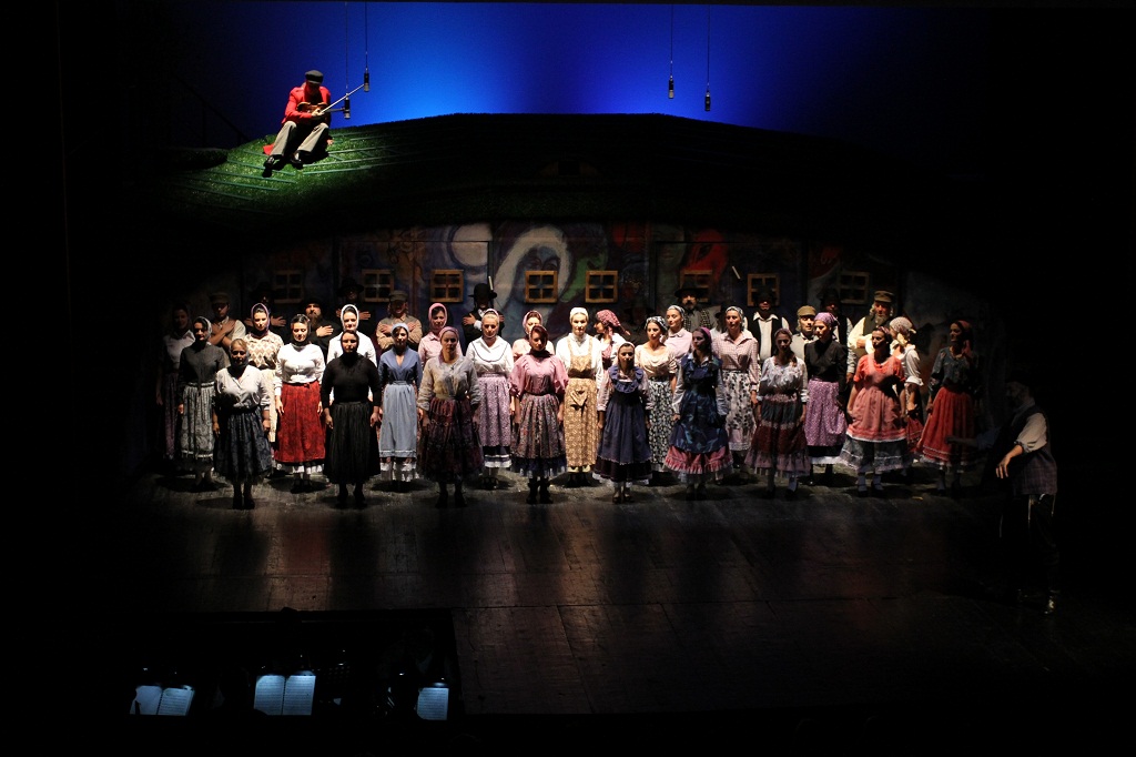 Scripcarul pe acoperiş este o producţie monumentală, cu decoruri impunătoare, o distribuţie mare care necesită voci bune, coregrafie complexă, orchestră live şi costume autentice.