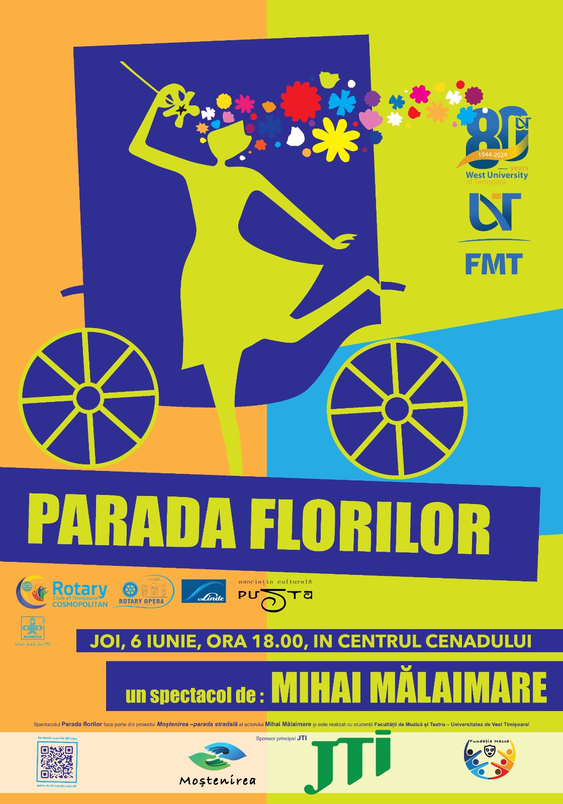 Joi, 6 iunie, ora 18:00, în centrul comunei Cenad, va avea loc spectacolul „Parada florilor”, susținut de studenți ai secției de actorie a Facultății de Muzică și Teatru din Timișoara. Ei vor crea scene de dans și teatru, împletite cu umor și momente de poezie, compuse de poetul Dimitrie Anghel, încadrate într-un univers floral, în regia lui Mihai Mălaimare.
