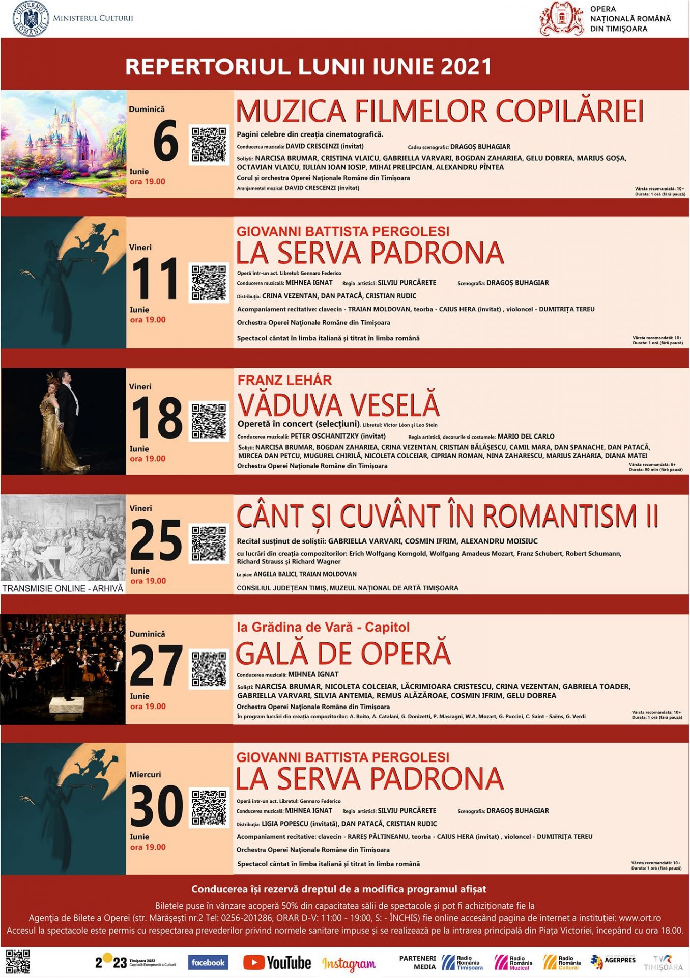 Repertoriul lunii iunie cuprinde spectacolele ”La serva padrona”, Văduva veselă”, o Gală de operă și un spectacol transmis online.