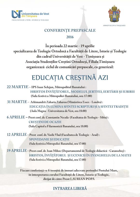 12 aprilie 2016 @ 17:00 – Preot conf. dr. Vasile Vlad de la Facultatea de Teologie Arad susține marți 12 aprilie, în Sala festivă a Mitropoliei Banatului, în cadrul ciclului de comunicări prepascale ”Educația creștină azi ”, conferința ”Spovedanie și educație”. Intrarea este liberă. Conferința, ca și celelalte din acest ciclu, va fi însoțită de imnuri adecvate perioadei Postului Mare, în interpretarea Corului […]