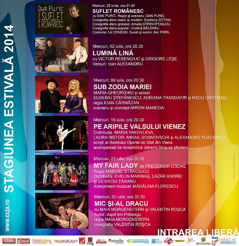 Consiliul Judeţean şi Centrul Cultural Judeţean Arad continuă iniţiativa de a găzdui în aer liber spectacole şi concerte, oferind astfel publicului un reper cultural valoros, dar şi posibilitatea implicării într-un parteneriat activ de viaţă culturală a acestuia.