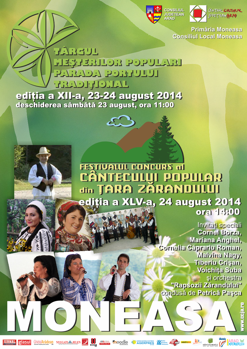 23 august 2014 – 24 august 2014 @ ore diverse – Staţiunea arădeană Moneasa va găzdui în zilele de 23 şi 24 august Târgului Meşterilor Populari, aflat la a 12-a ediţie, iar în 24 august şi Festivalul-concurs la Cântecului Popular din Ţara Zărandului aflat la a 45-a ediţie, unul dintre cele mai longevive festivaluri din ţară. Concursul se adresează tinerilor solişti vocali cu vârsta cuprinsă între 16 […]