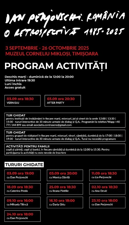 Expoziția ”Dan Perjovshi. România. O retrospectivă 1985–2025”, deschisă în perioada 3 septembrie – 26 octombrie 2025 la Muzeul Corneliu Miklosi, reunește desen, performance, acțiuni civice, proteste, publicații și instalații efemere, compunând o frescă a României din ultimii 40 de ani.