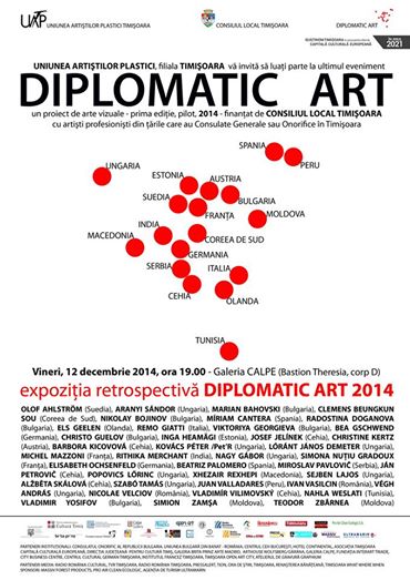 – vineri, 12 decembrie 2014, ora 19.00, la Galeria Calpe (Bastion Theresia, corp D), ultimul vernisaj, respectiv expoziţia retrospectivă a artiştilor participanţi la toate expozitiile DIPLOMATIC ART 2014, eveniment care va încheia oficial ediţia pilot. Vor expune: Olof Ahlström (Suedia), Aranyi Sándor (Ungaria), Marian Bahovski (Bulgaria), Clemens Beungkun Sou (Coreea de Sud), Nikolay Bojinov (Bulgaria), Míriam Cantera (Spania), Radostina Doganova (Bulgaria), Els Geelen (Olanda), Remo Giatti (Italia), Viktoriya Georgieva (Bulgaria), Bea Gschwend (Germania), Christo Guelov (Bulgaria), Inga Heamägi (Estonia), Josef Jelínek (Cehia), Christine Kertz (Austria), Barbora Kicovová (Cehia), Kovács Péter /Pet’R (Ungaria), Lóránt János Demeter (Ungaria), Michel Mazzoni (Franţa), Rithika Merchant (India), Nagy Gábor (Ungaria), Simona Nuţiu Gradoux (Franţa), Elisabeth Ochsenfeld (Germania), Beatriz Palomero (Spania), Miroslav Pavlovič (Serbia), Ján Petrovič (Cehia), Popovics Lőrinc (Ungaria), Xhezair Rexhepi (Macedonia), Sejben Lajos (Ungaria), Alžběta Skálová (Cehia), Szabó Tamás (Ungaria), Juan Valladares (Peru), Ivan Vasilcin (România), Végh András (Ungaria), Nicolae Velciov (România), Vladimír Vilimovský (Cehia), Nahla Weslati (Tunisia), Vladimir Yosifov (Bulgaria), Simion Zamşa (Moldova), Teodor Zbârnea (Moldova).