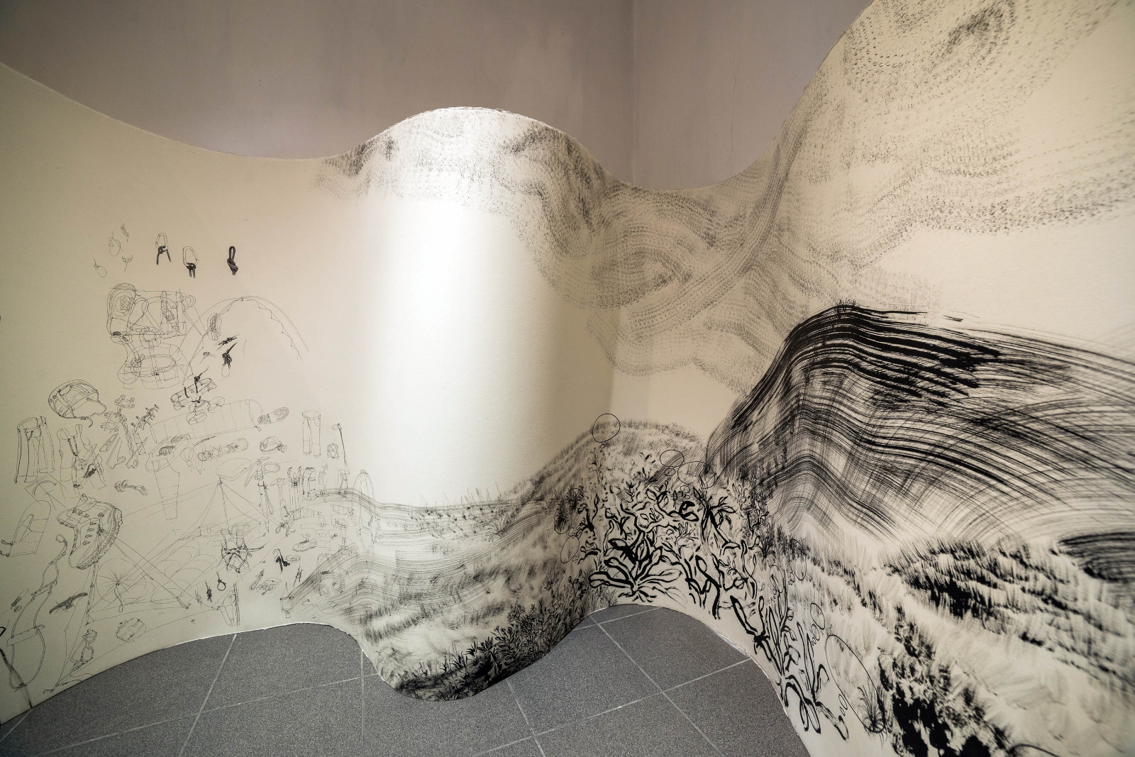 «Panoramicul „Munte de echipament” (2016), un diptic de peste douăzeci de metri ce transformă un inventar de mărfuri, plante și clădiri absurde într‑un masiv montan. Polipticul figurativ „Capacitate: 460 de pasageri” (2018‑2025) este o aliniere de siluete rupestre ce archivează mobilitatea omului la început de mileniu și sfârșit de evoluție. Intim și istoric, grandios și ironic, traseul propus cartografiază ruinele modernității transcrise în limbaj poetic și grafic.» – spune Bogdan Achimescu