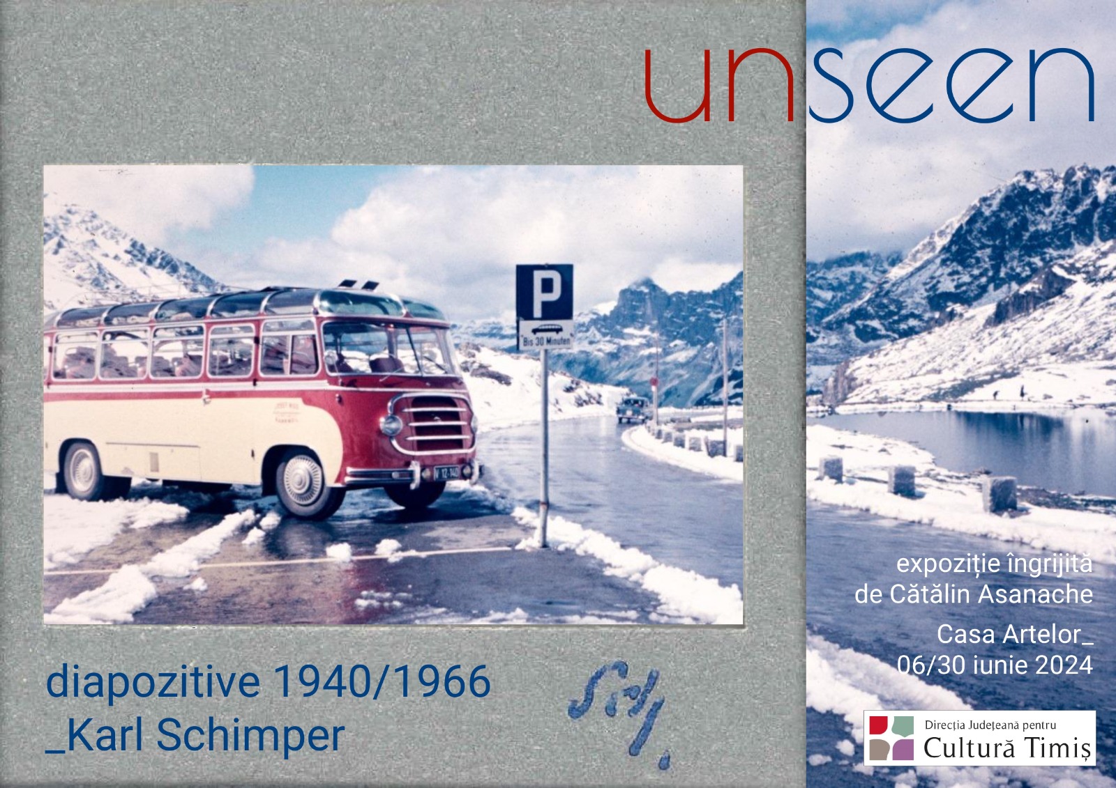 Galeria Pygmalion a Casei Artelor din Timișoara găzduiește în perioada 6 – 30 iunie 2024 o expoziție cum nu s-a mai văzut. (un)seen este numele demersului plastic care aduce în fața publicului o parte dintr-o colecție impresionantă de imagini fotografice color, ce surprind secvențe dintr-o epocă deopotrivă interesantă și provocatoare: perioada 1940-1966. Fotografiile fac parte dintr-o colecție privată și poartă semnătura fotografului austriac Karl Schimper. (1904-1966).