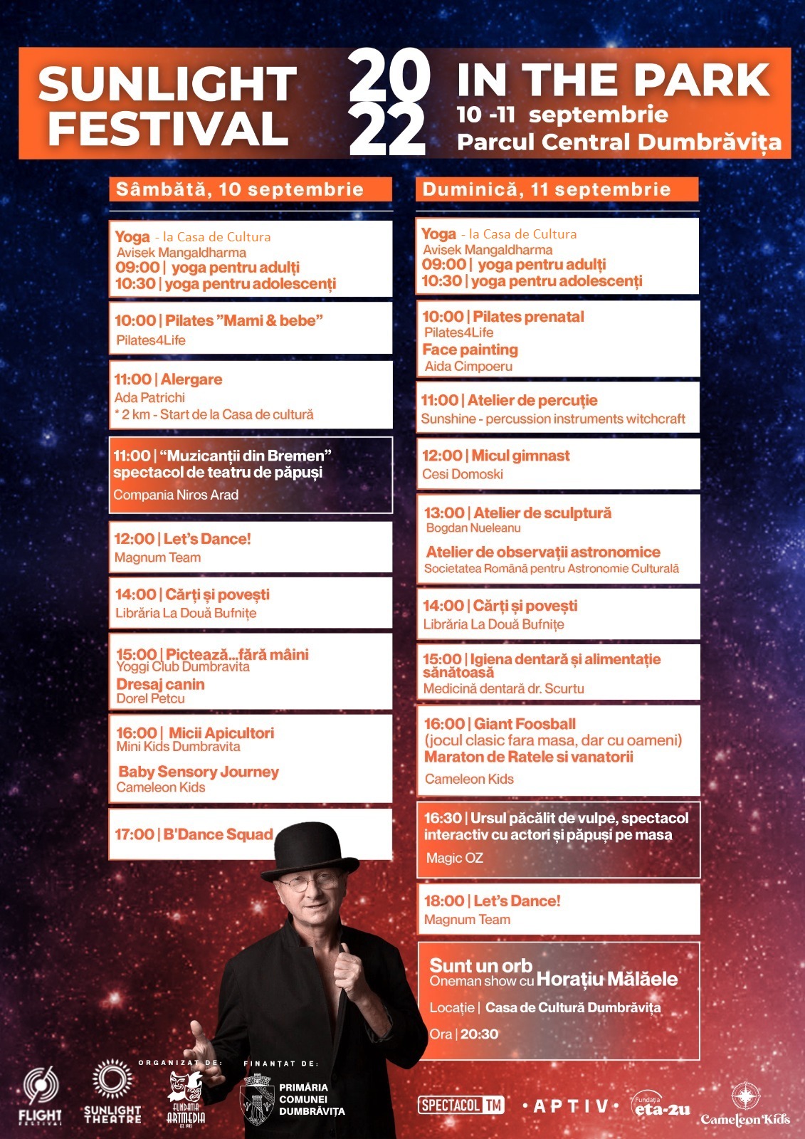 Copiilor li se pregătesc două spectacole de teatru de păpuși, iar pentru adulți o piesă în limba maghiară și monologul teatral de excepție Horațiu Mălăele – Sunt un orb.