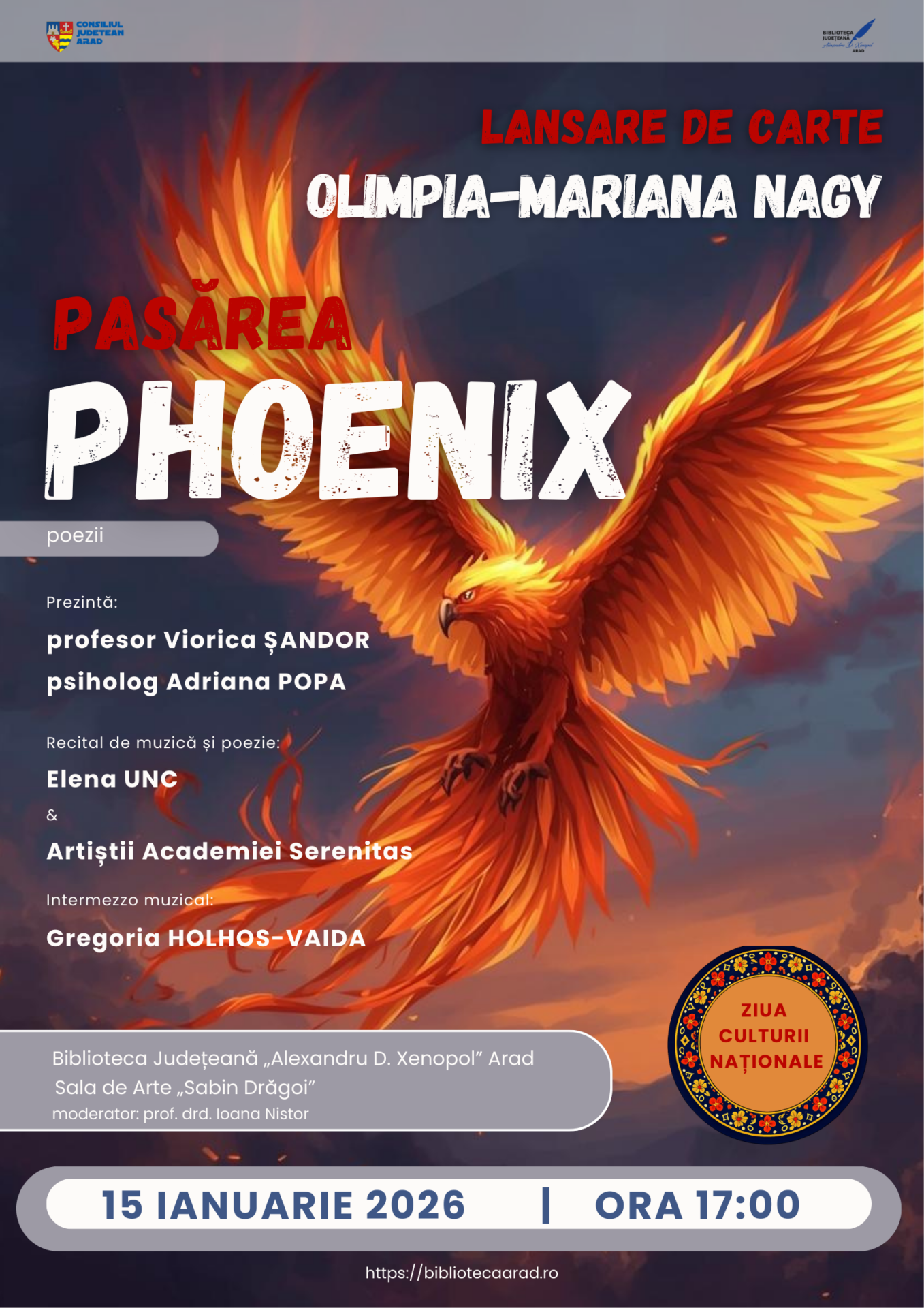 De Ziua Națională a Culturii, Biblioteca Județeană „Alexandru D. Xenopol” Arad găzduiește joi, 15 ianuarie 2026, de la ora 17:00, în Sala de Arte „Sabin Drăgoi”, lansarea volumului de poezie „Pasărea Phoenix” de Olimpia-Mariana Nagy – un demers literar care vorbește despre fragilitate, curaj și renaștere prin cuvânt.