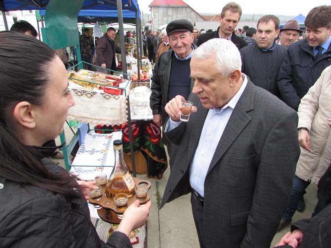 Oaspete de onoare, ministrul agriculturii Petre Daea, întâmpinat cu pâine și sare și cu un pahar de răchie, pe care-l ciocnește cu fostul ministru al agriculturii, Valeriu Tabără, prezent la toate cele 35 de ediții ale târgului, și cu primarul Mirco Ilie Lechici.