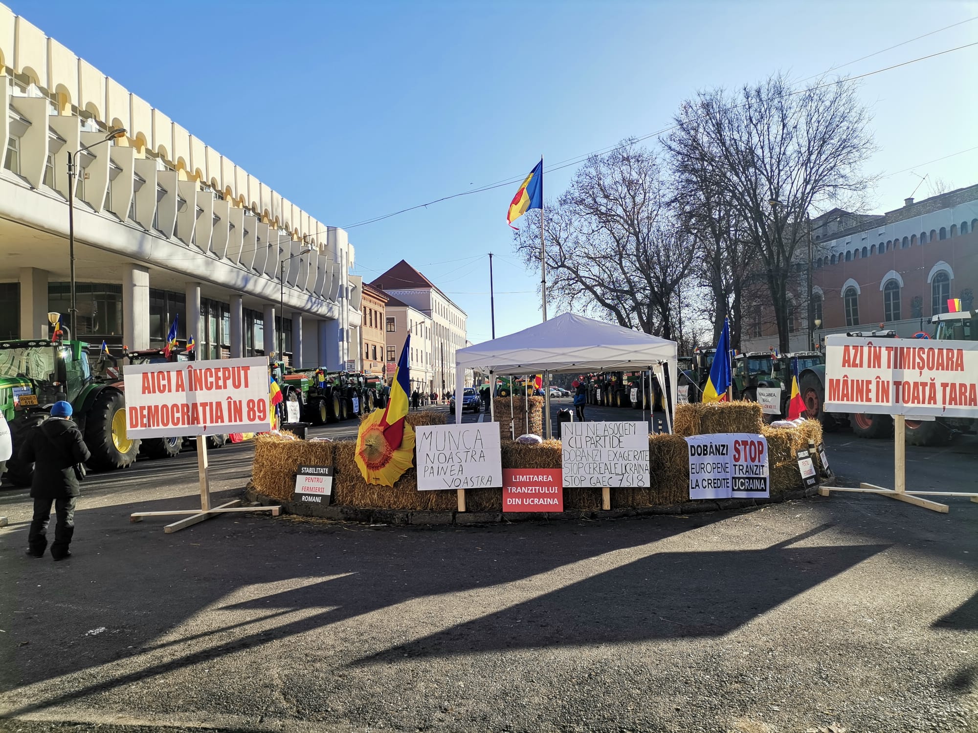 Pentru a doua zi consecutiv, zeci de fermieri protestează în Piața Huniade din centrul Timișoarei.