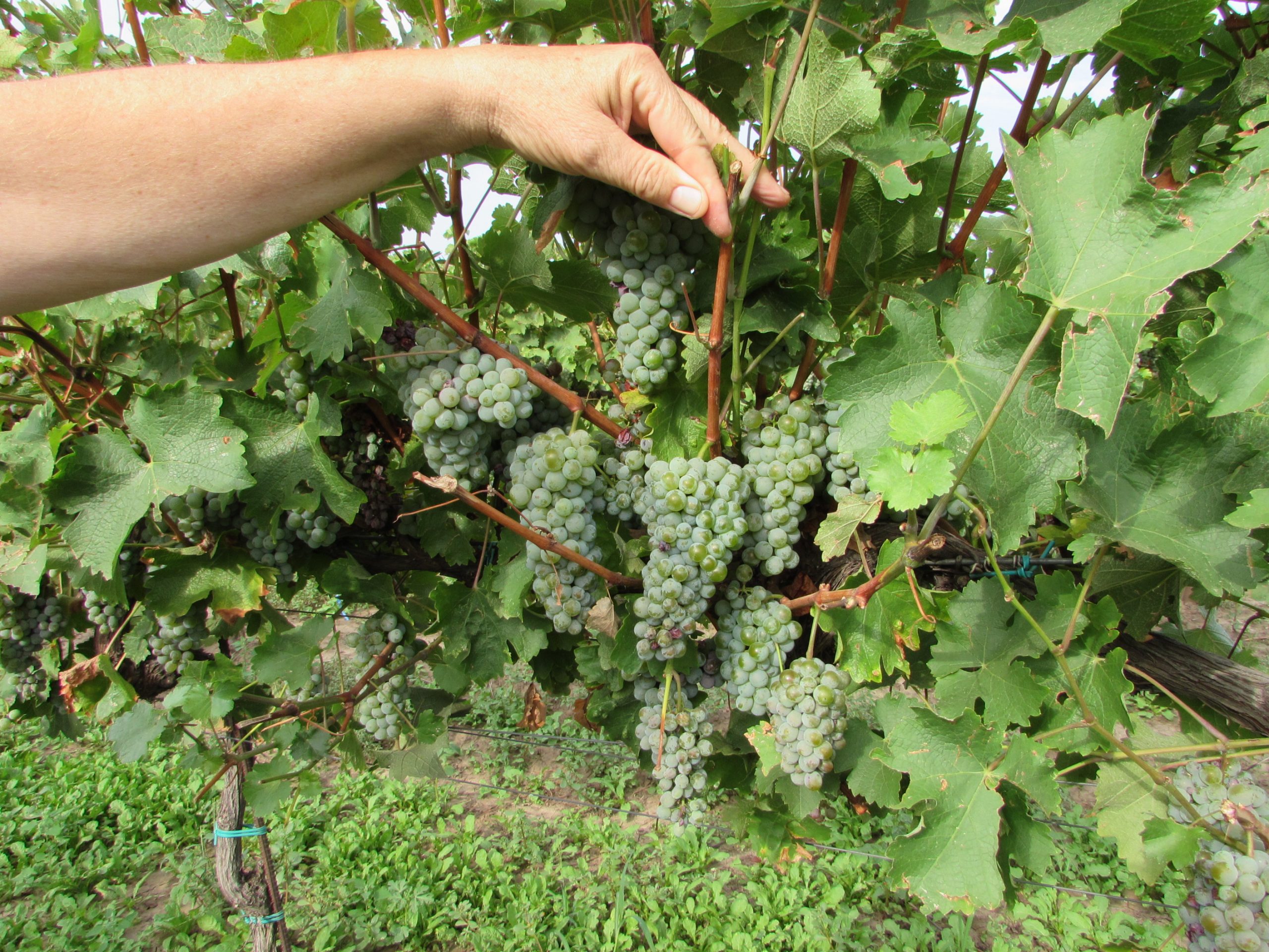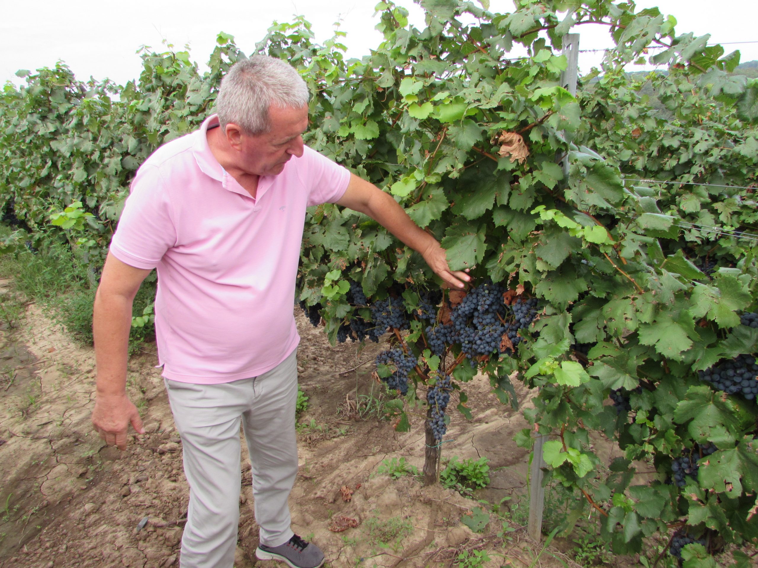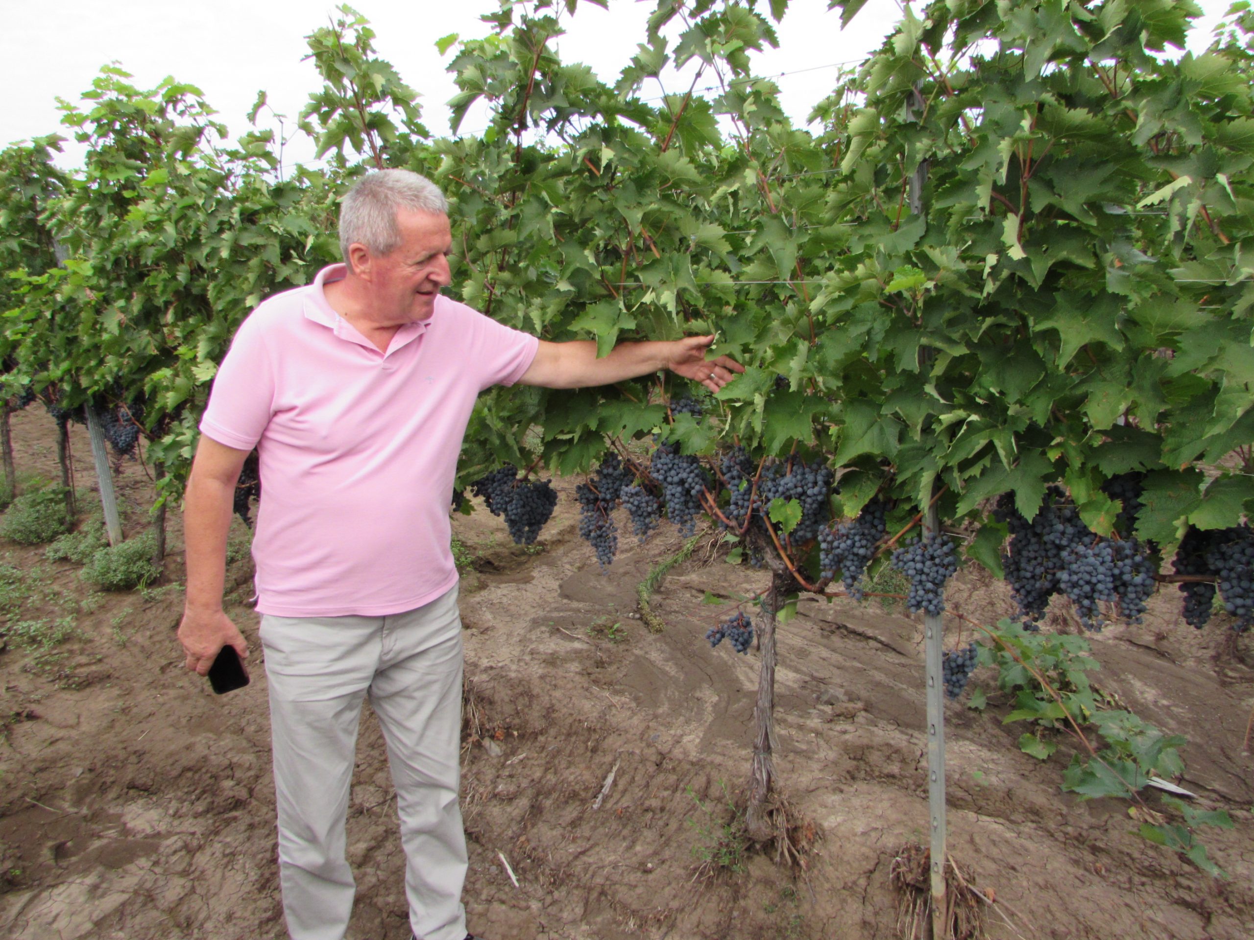 Directorul general Gheorghe Iova este mândru de calitatea strugurilor din vie, dar și de calitatea frunzelor, pentru că ele produc hrana pentru întreaga plantă. Aceștia sunt struguri pentru vinuri de top, pentru că după cum vedeți între rânduri sunt ciorchinii tăiați de pe butuc, cam jumătate dintre cei existenți, pentru a mări calitatea celor rămași. Renunți la cantitate pentru un spor substanțial de calitate.