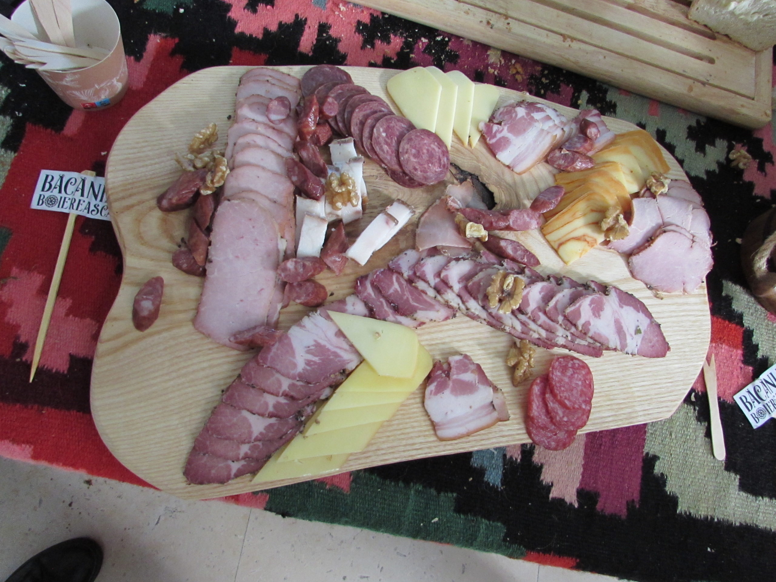 Din Bucovina românească, din Suceava, au venit cei de la Băcănia boierească. Cu produsele obţinute din carne de la animalele proprii, vite Angus şi porci Bazna, după cum vedeţi, se poate întinde o masă boierească. Mai cu seamă că şi pâinea e făcută în brutăria proprie. Degustătorii pofticioşi au fost pe punctul de a mă lăsa fără cozonac pentru fotografie.