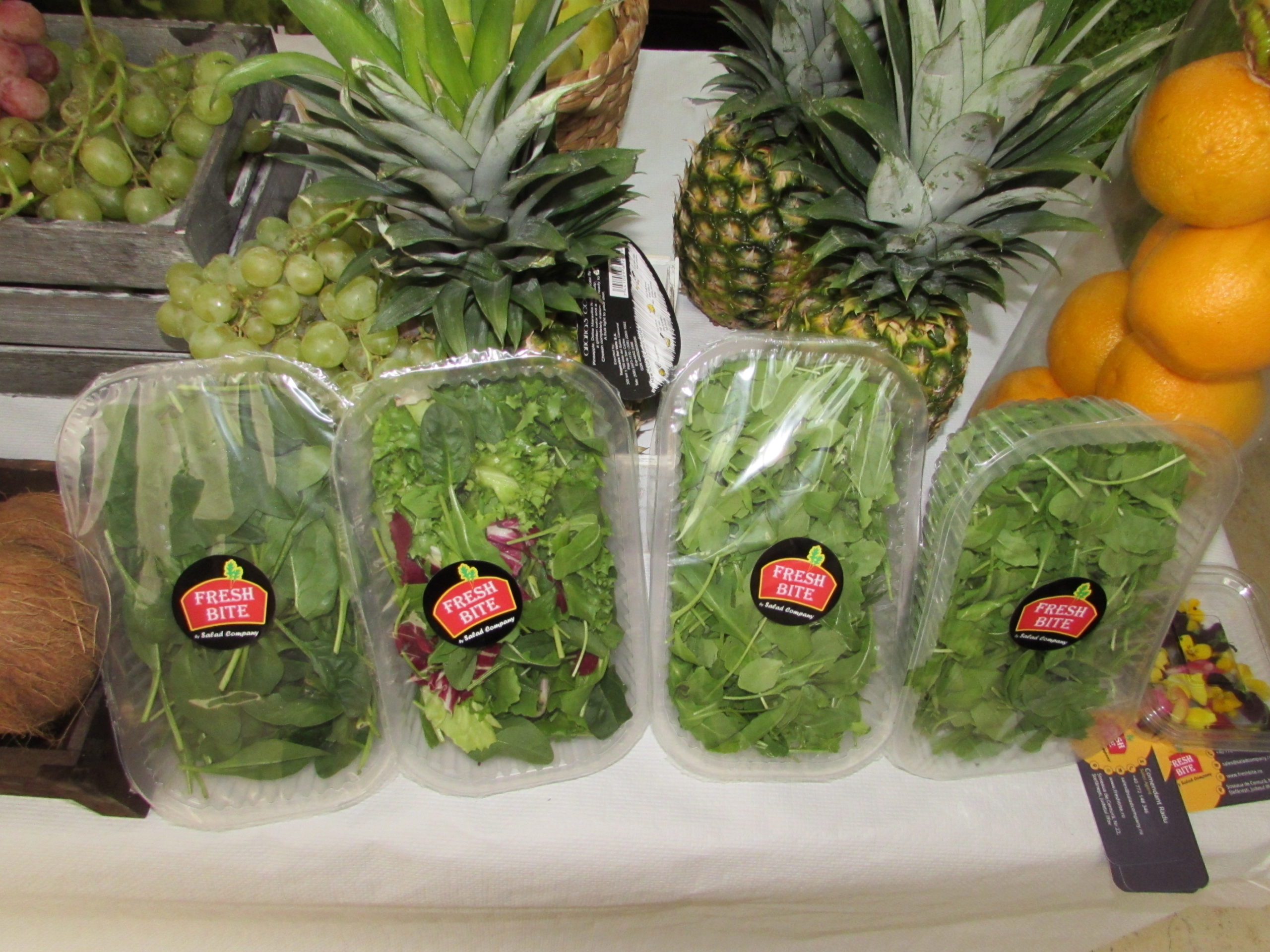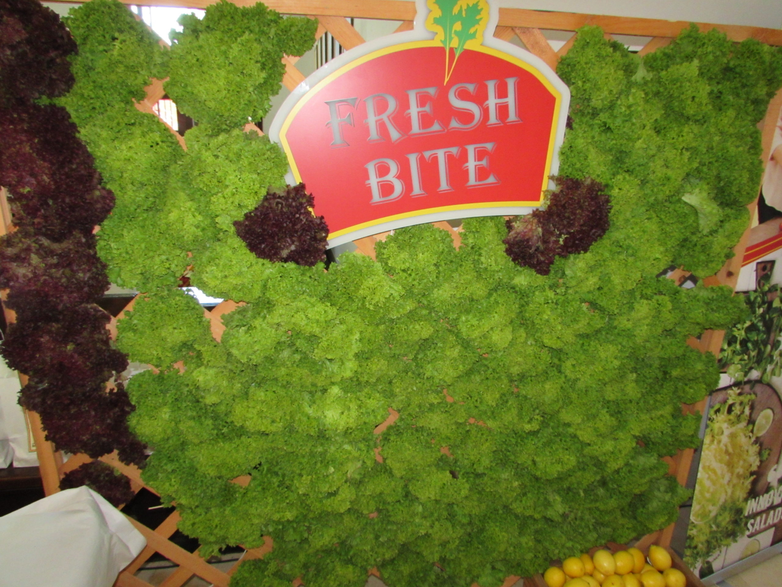 După atâtea cărnuri şi brânzeturi, să mai trecem şi pe salate, pentru că organismul are nevoie şi de fibre. Iar gamele de mere sunt dezvoltate împreună cu institutul din Mărăcineni-Piteşti, aparţinând Academiei de ştiinţe agricole şi silvice a României. Cei de la Fresh bite au avut o realizare extraordinară, reuşind să introducă în benzinării fructe proaspete. Tot o realizare extraordinară, bineînţeles că la alt nivel, este panoul cu salate din imagine. L-am fotografiat şi de aproape ca să vedeţi că e făcut din salate şi să hotărâţi dumneavoastră cu ce seamănă.