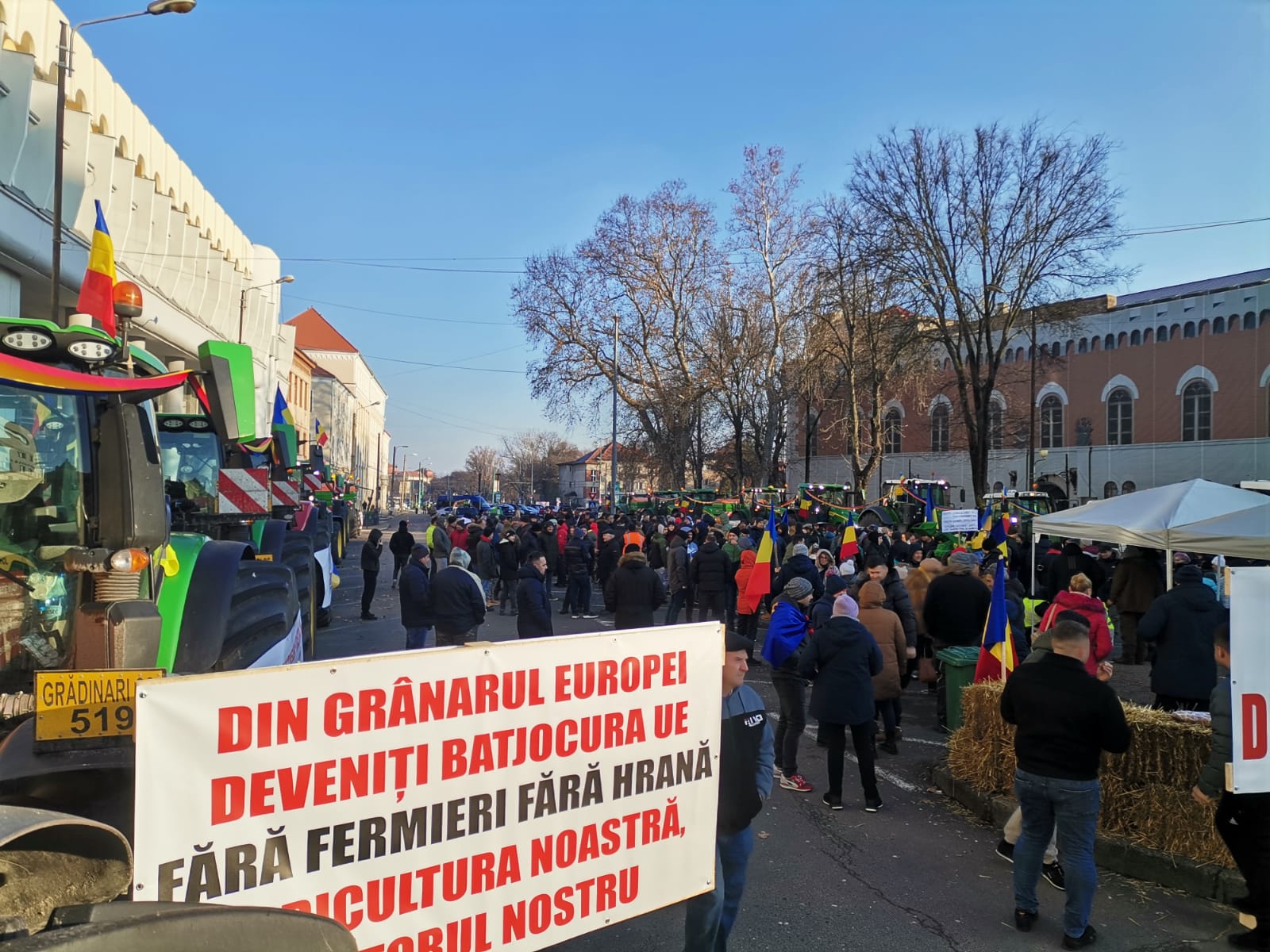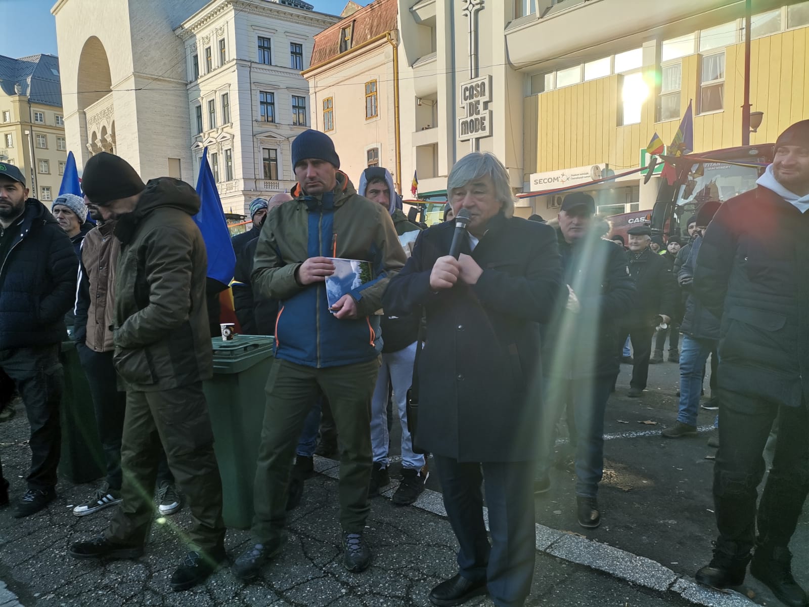 Aproximativ 300 de fermieri din județele Timiș, Arad și Caraș-Severin au venit duminică după-amiază în Piața Huniade. Lor li s-a alăturat și Dimitrie Muscă, proprietarul Combinatului Agroindustrial Curtici.