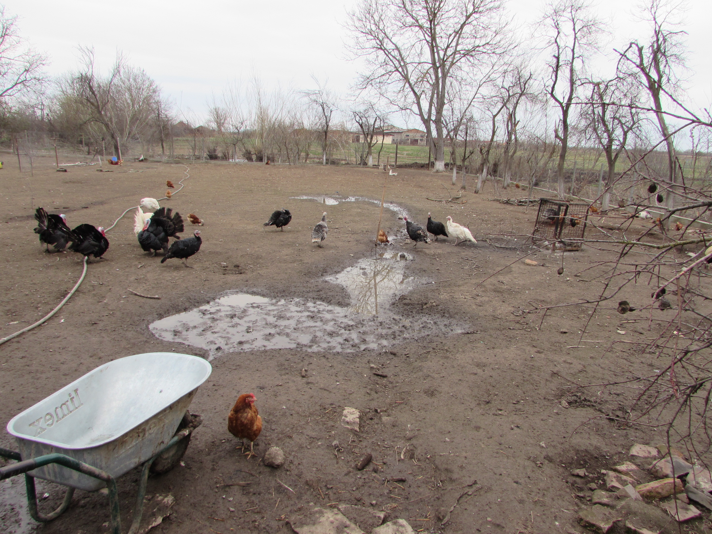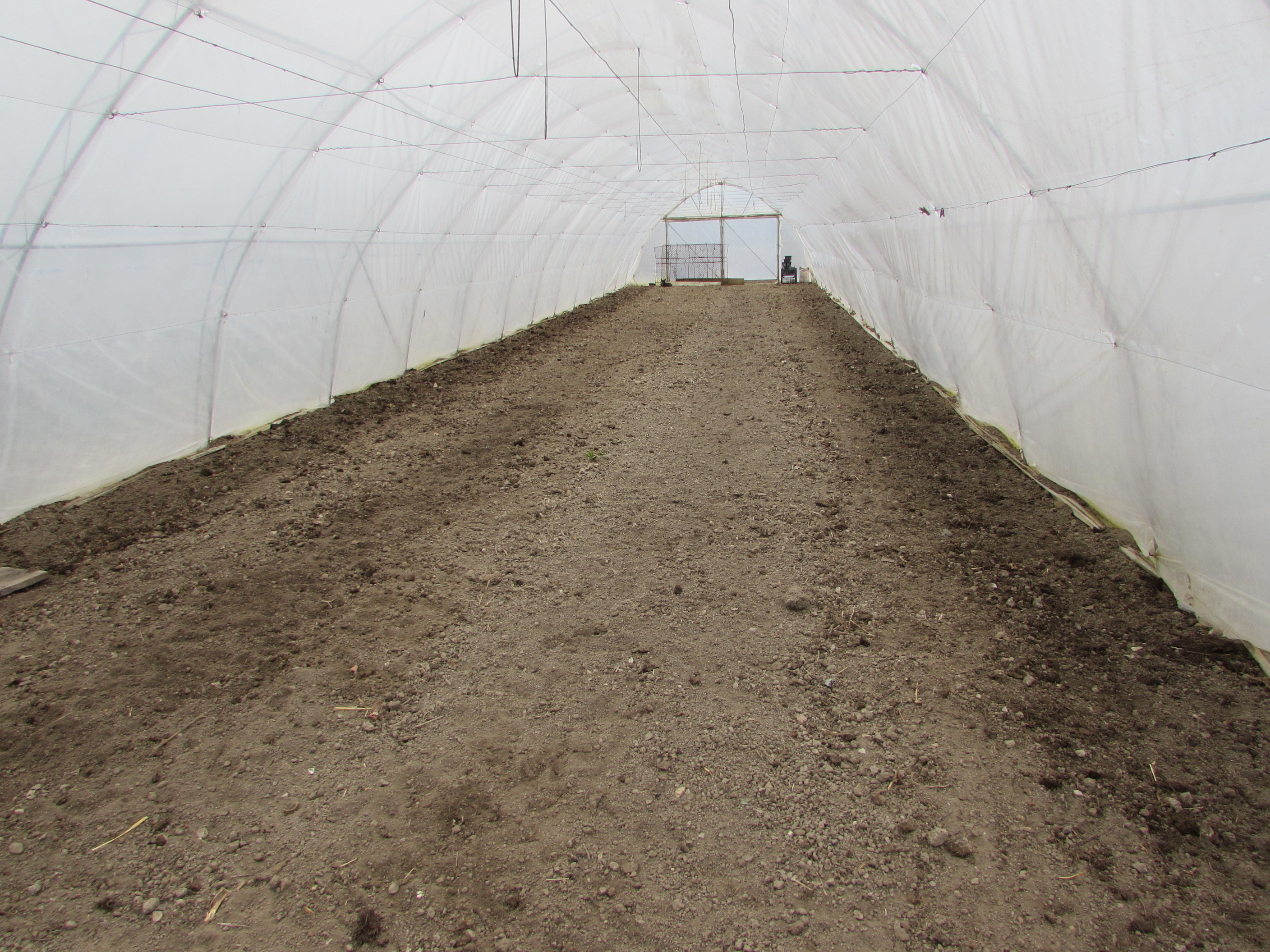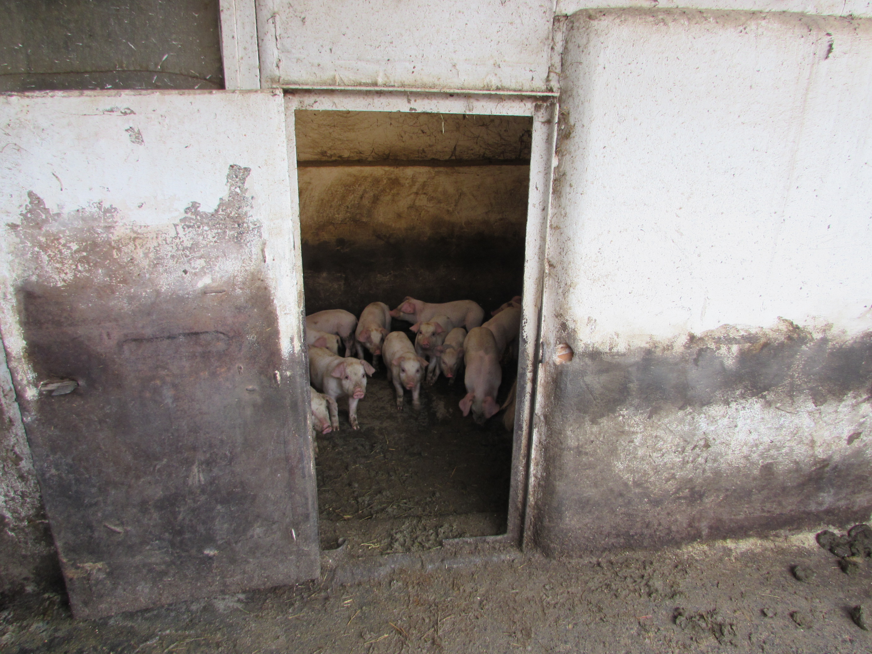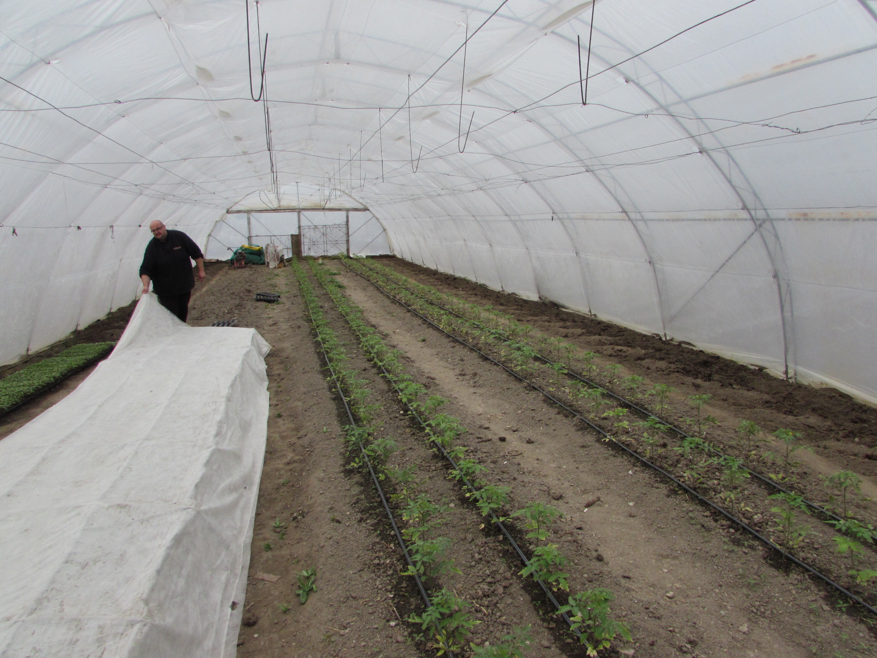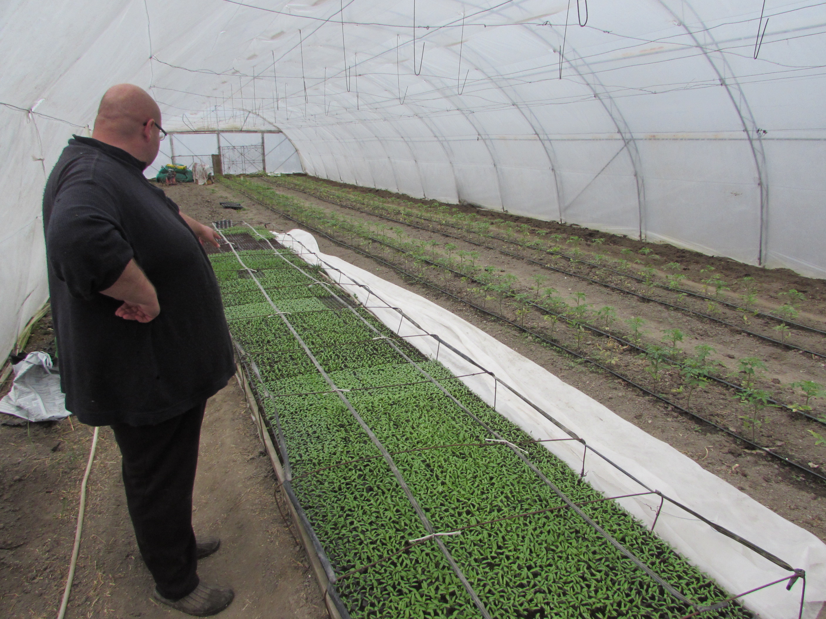 În grădina casei se află solariile, unul cu viitoarele roșii timpurii și cu răsadurile, celălalt pregătit pentru repicatul tinerelor plante ce se dezvoltă acum în primul solar. Ne-a întâmpinat un miros proaspăt de gunoi de grajd, pe care, din păcate, nu avem cum să-l transmitem pentru cei ce doresc să simtă temelia unei producții bio. Și tot pe lângă casă două scroafe cu purcei.