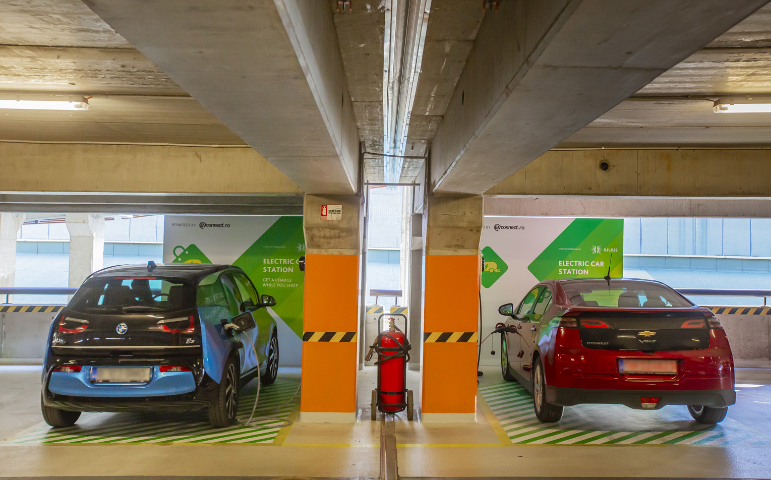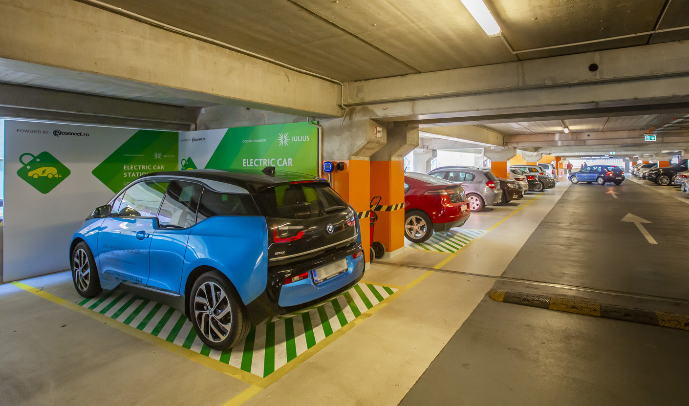 Primele stații de încărcare a mașinilor electrice au fost instalate în parcarea Openville din Timișoara, urmând să fie aduse stații și în parcarea subterană a Iulius Mall.