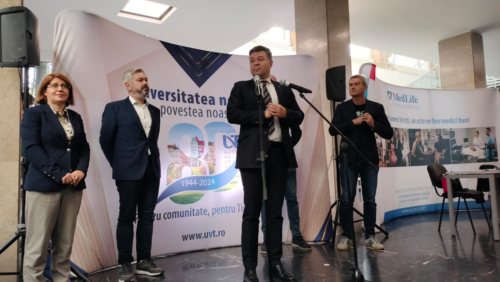 Universitatea de Vest întotdeauna încurajează această interacțiune și acest dialog între studenții și absolvenții noștri și companiile angajatoare din regiunea Vest. Așteptăm sute de studenți care să interacționeze. Pe lângă ofertele de locuri de muncă, îi încurajăm pe partenerii noștri instituționali de a veni către studenți și cu stagii de practică și stagii de internship pentru că este util pentru viitoarea lor carieră, să poată să interacționeze, dar în același timp să poată să-și urmeze traiectul firesc educațional”, spune Flavia Barna, prorector al Universității de Vest.