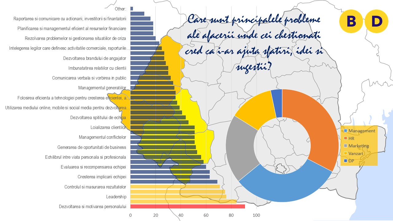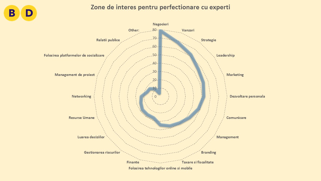 Atunci când au fost întrebați despre nevoile de training pentru care ar fi dispuși să își perfecționeze abilitățile cu cei mai buni experți, respondenții au indicat, în ordine: negocieri, vânzări, strategie, leadership, marketing, dezvoltare personală, comunicare, management, branding, taxare și fiscalitate.