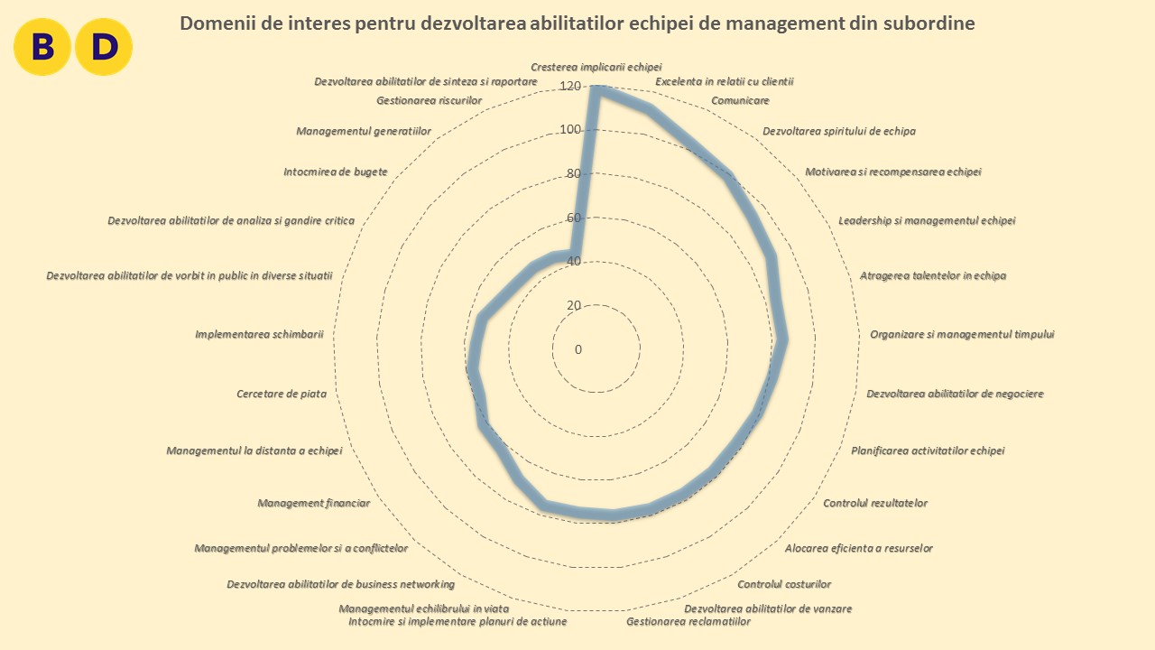 Se mai poate remarca, de asemenea, scorul egal înregistrat, în viziunea top managerilor, de dezvoltarea spiritului de echipă, motivarea și recompensarea, controlul rezultatelor, respectiv întocmirea și implementarea planurilor de acțiune. De altfel, top managerii au fost singurii care le-au indicat pe ultimele două drept abilități esențiale, din nou o consecință probabilă a setului specific de competențe cu care operează acest grup de respondenți.