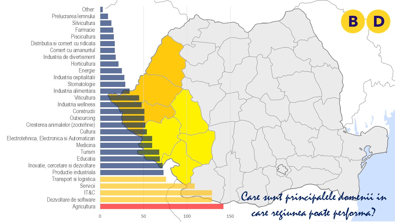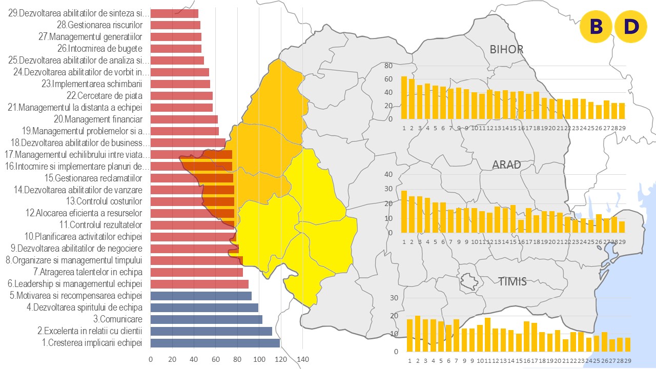 Dacă diferențele de opțiuni în ceea ce îi privește pe profesioniști pot fi explicate prin competențele particulare ale acestora, competențe mai apropiate de activități intelectuale și creative decât de managementul efectiv al organizațiilor, a existat însă și o mică surpriză la analiza distribuției voturilor pe județe; astfel, bihorenii au plasat pe poziția a treia înțelegerea și folosirea tehnologiei, opțiune plasată abia pe locul VI ca medie regională. Printre explicațiile posibile se numără efectul de antrenare al investițiilor în IT&C declanșat de dezvoltarea industriei de profil în județul vecin Cluj.