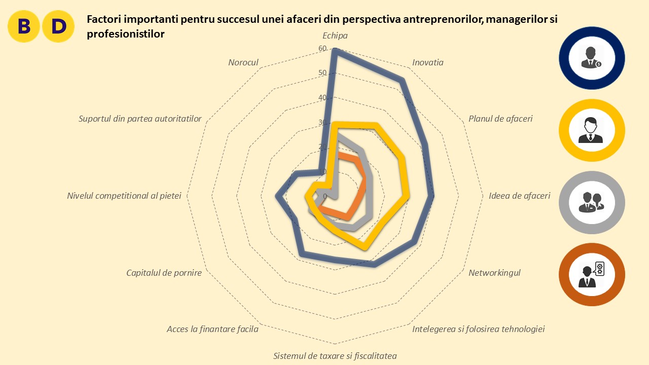 Răspunsurile au indicat o anumită omogenitate de opinii între antreprenori, manageri de top și manageri, pe de o parte, față de grupul profesioniștilor, de cealaltă parte. Dacă pentru primii cei mai importanți factori de succes indicați au fost, în ordine, echipa, inovația și planul de afaceri, profesioniștii au pus pe primul plan inovația, apoi planul de afaceri, echipa și ideea de afaceri (ultimele două la egalitate de voturi).