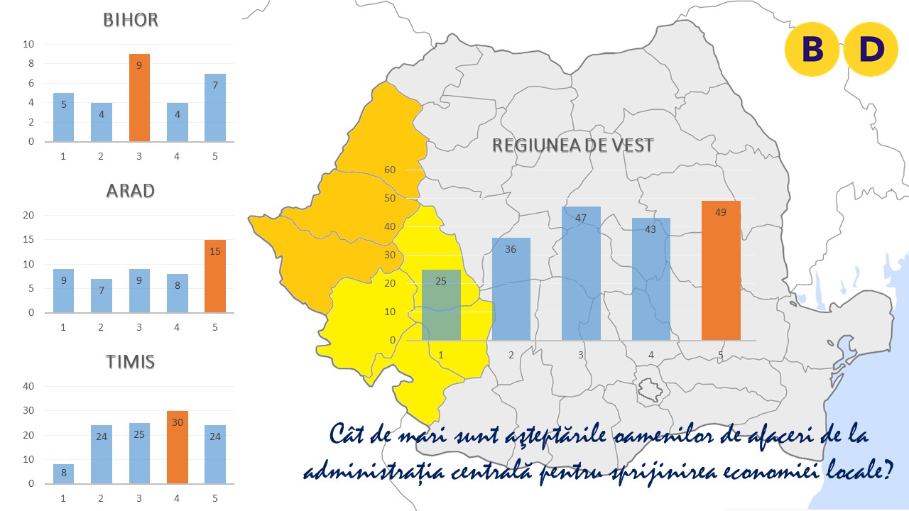 Există, de asemenea, o nevoie clar resimțită de suport din partea autorităților; la întrebarea „cât de mari sunt așteptările de la administrația centrală pentru sprijinirea economiei locale?” în niciunul dintre județe nu s-a înregistrat o medie mai mică de 3 (pe o scală de de la 1 la 5). În județul Arad s-a înregistrat cea mai mare diferență dintre numărul de total de respondenți care au indicat o valoare de 5 și orice altă variantă de răspuns, fapt care arată clar că managerii și oamenii de afaceri arădeni resimt lipsa sprijinului autorităților publice mai acut decât vecinii lor. Cum bine se știe, Aradul se află pe ultimul tronson al autostrăzii A1, încă nefinalizată, care ar urma să lege Bucureștiul de vestul Europei, ca parte a Coridorului IV paneuropean de transport rutier; din acest motiv, deciziile administrației centrale afectează direct economia județului.