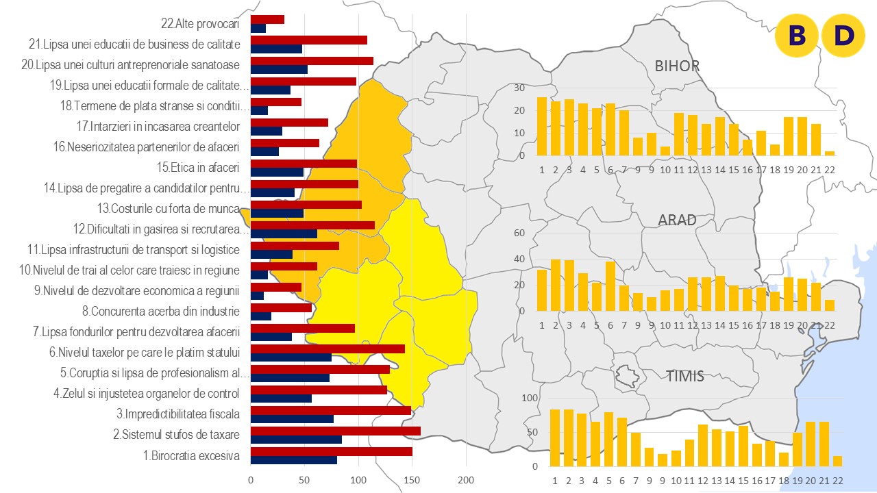 Cu privire la provocările întâmpinate de afacerile din regiune, sistemul stufos de taxare a fost unanim nominalizat ca fiind principalul obstacol; de altfel, a fost indicat ca atare de către toate grupurile chestionate, de la antreprenori la profesioniști, dintr-o listă de 22 de probleme cu care se confruntă mediul de business. Pe locurile următoare s-au situat birocrația excesivă, impredictibilitatea fiscală și nivelul taxelor, urmate de corupție și de zelul și injustețea organelor de control. Altfel spus, cinci din cele șase principale provocări pentru afacerile din vestul țării țin, în percepția celor chestionați, de politici publice și administrative, la care se adaugă corupția, la rândul său un efect secundar al unui sistem de reglementare care funcționează defectuos.