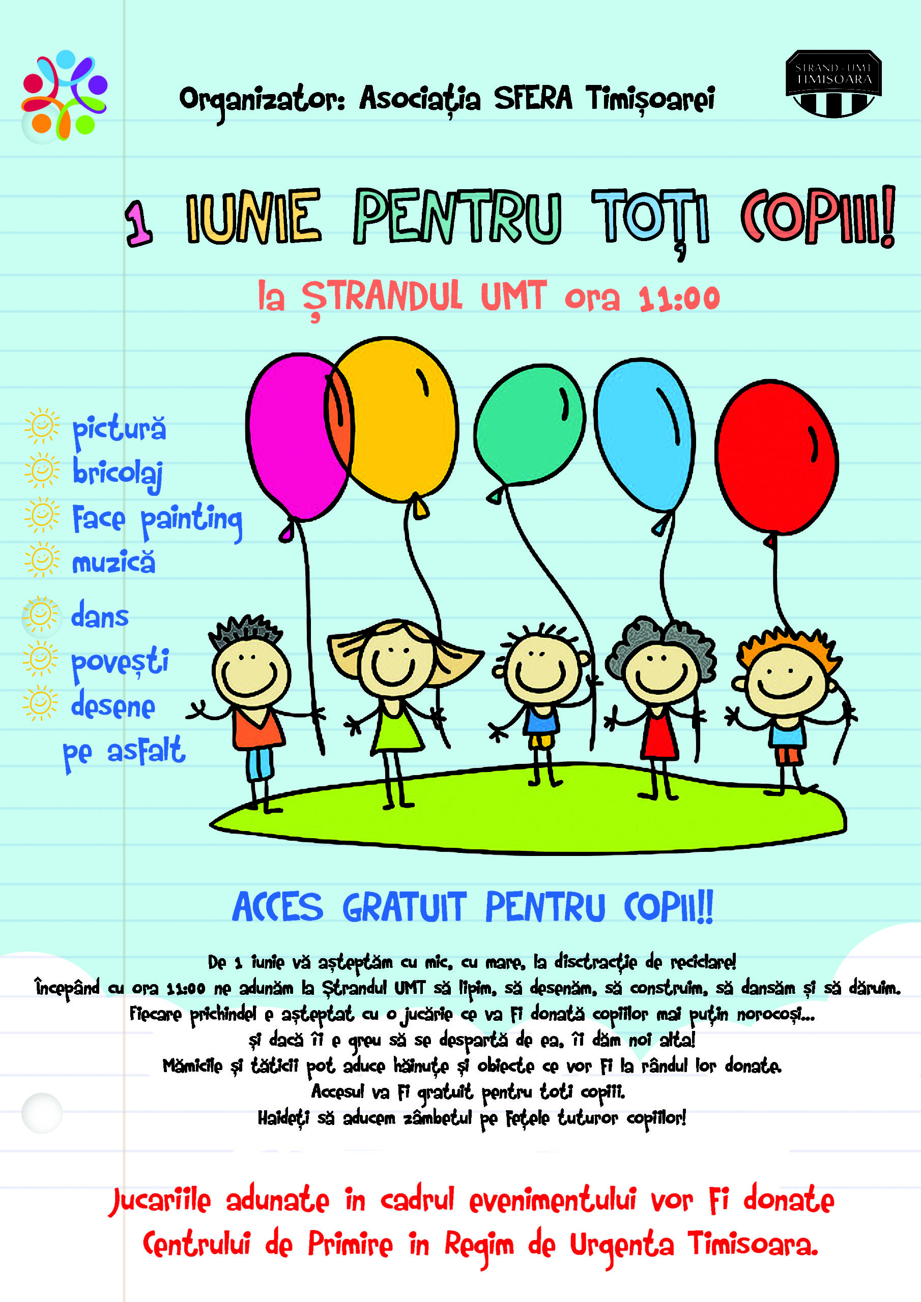 Timişorenii sunt invitaţi, cu mic, cu mare, de Ziua Internaţională a Copilului, să se distreze la ştrandul UMT, la a treia ediţie a evenimentului „1 Iunie pentru toţi copiii”, organizat de Asociaţia „Sfera Timişoarei”.