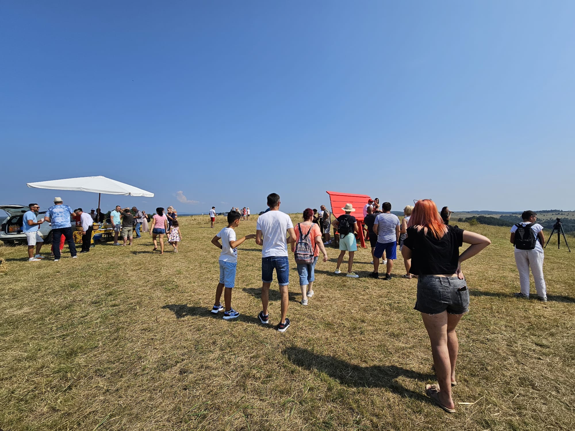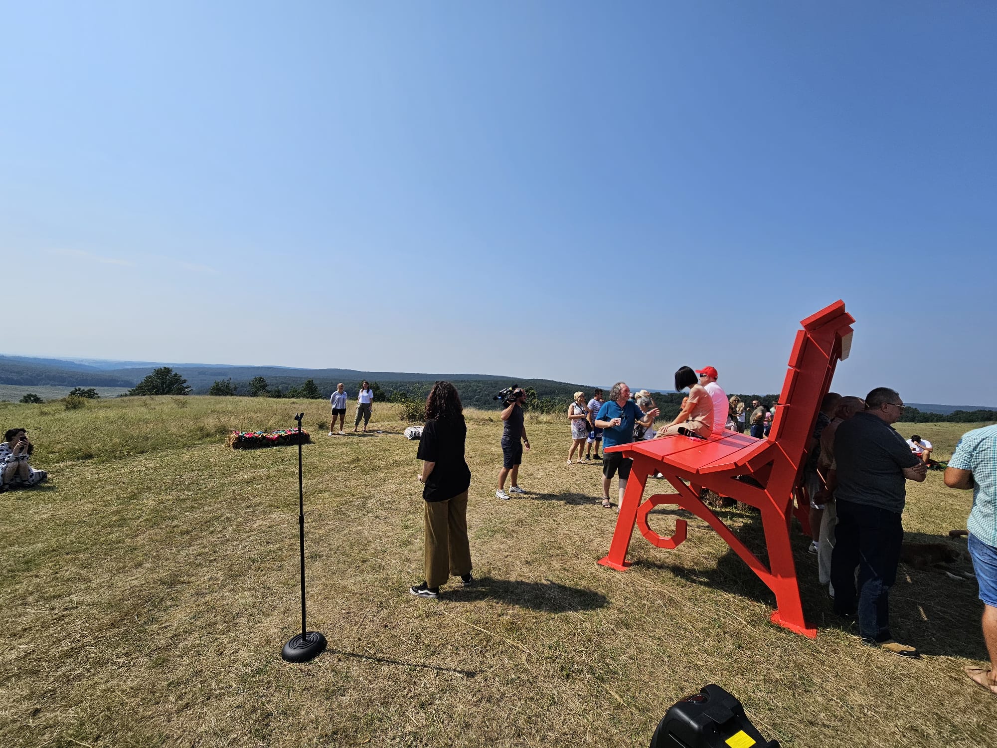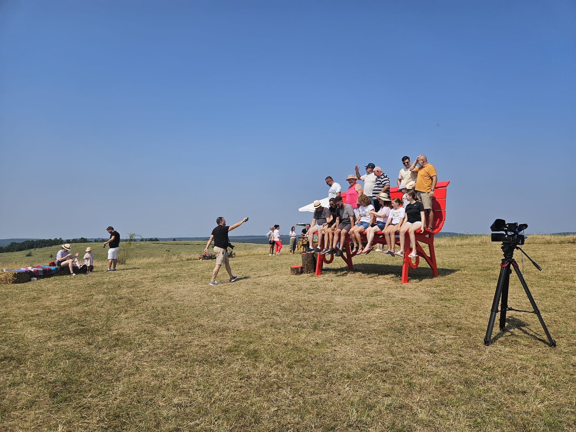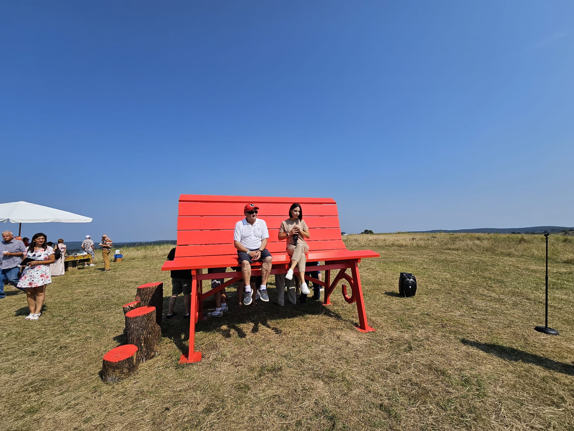 Aproximativ 200 de persoane au participat ieri la inaugurarea celei mai mari bănci de lemn din România, la hotarul dintre județele Timiș și Arad.